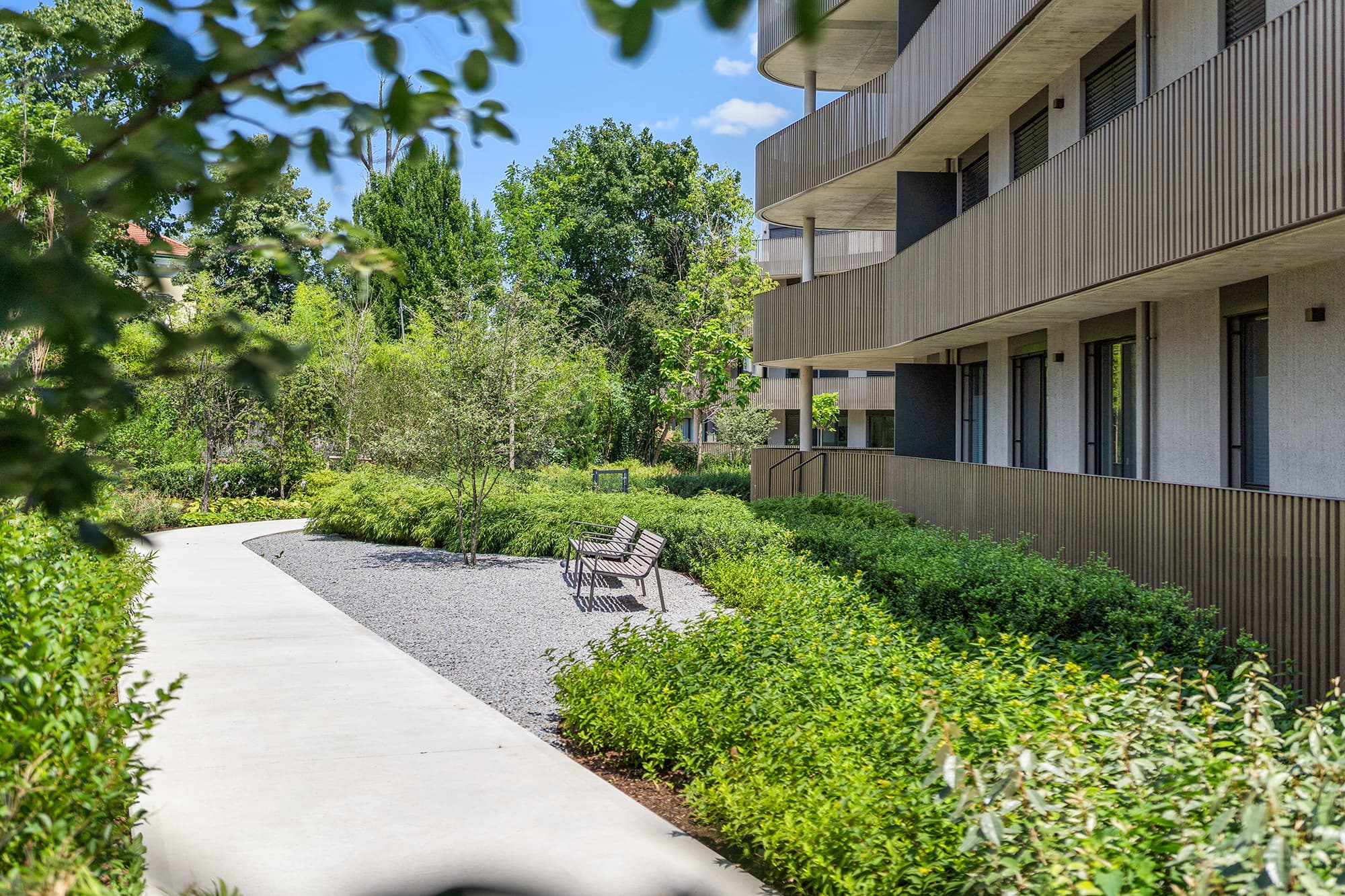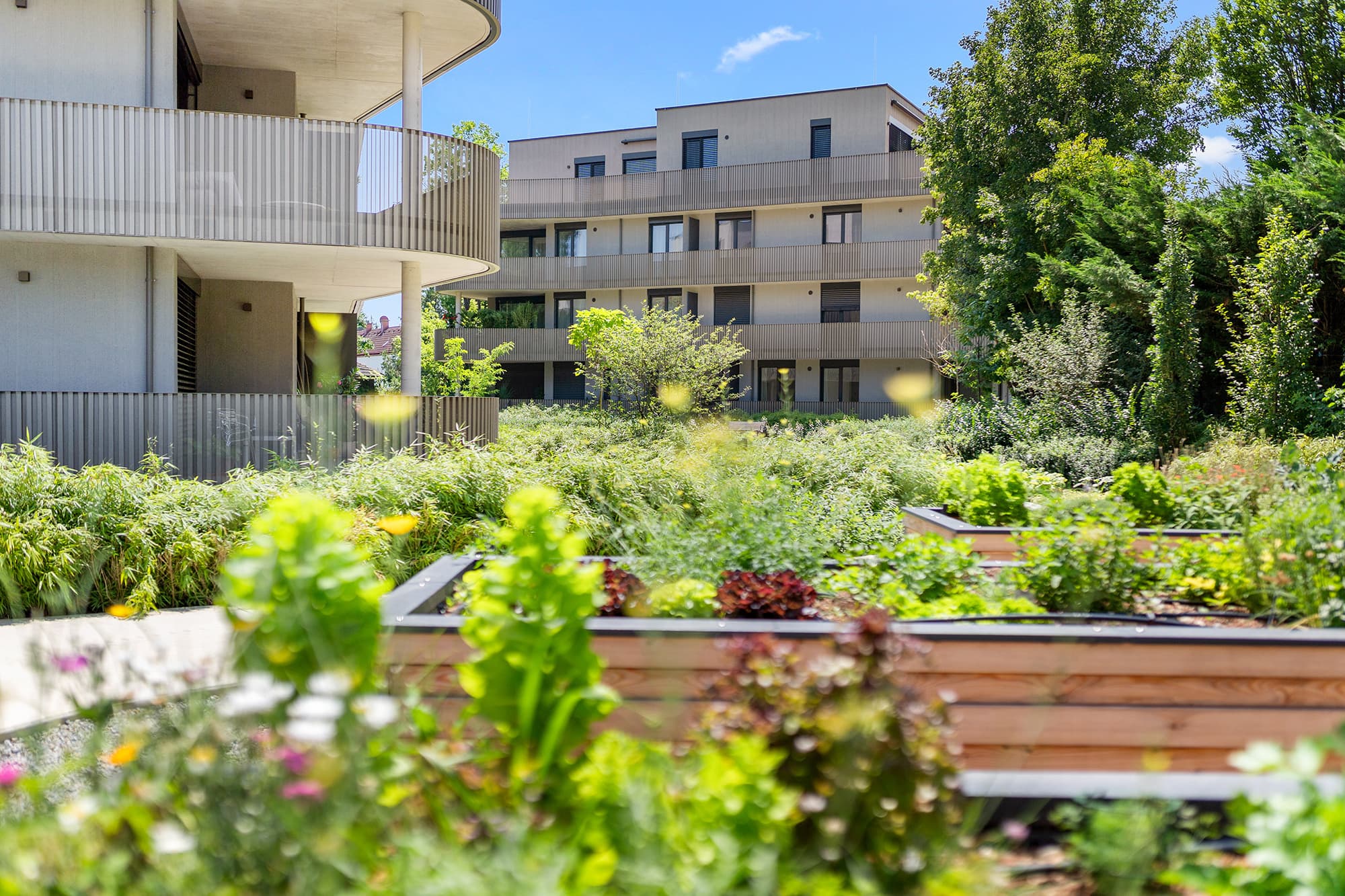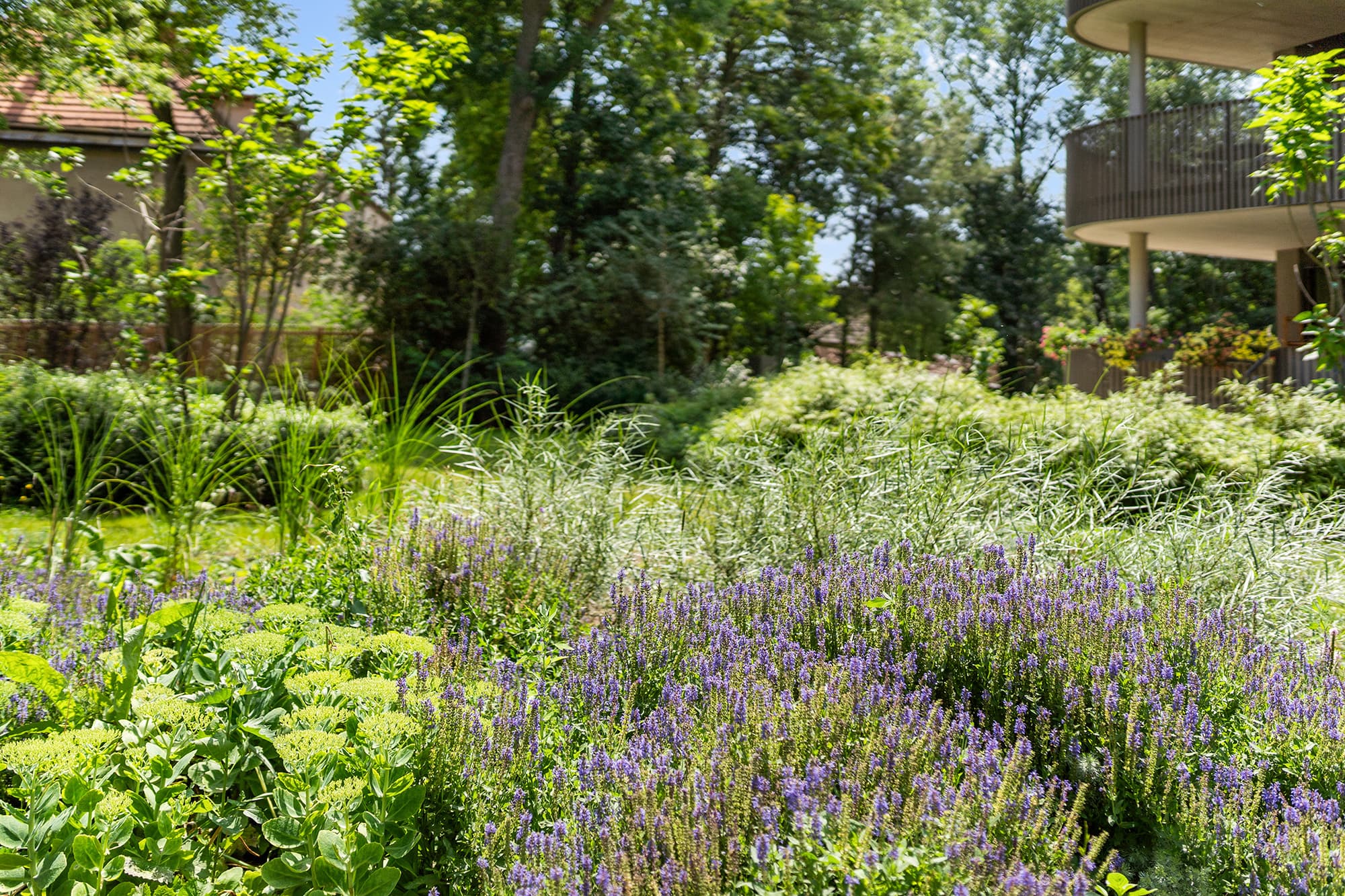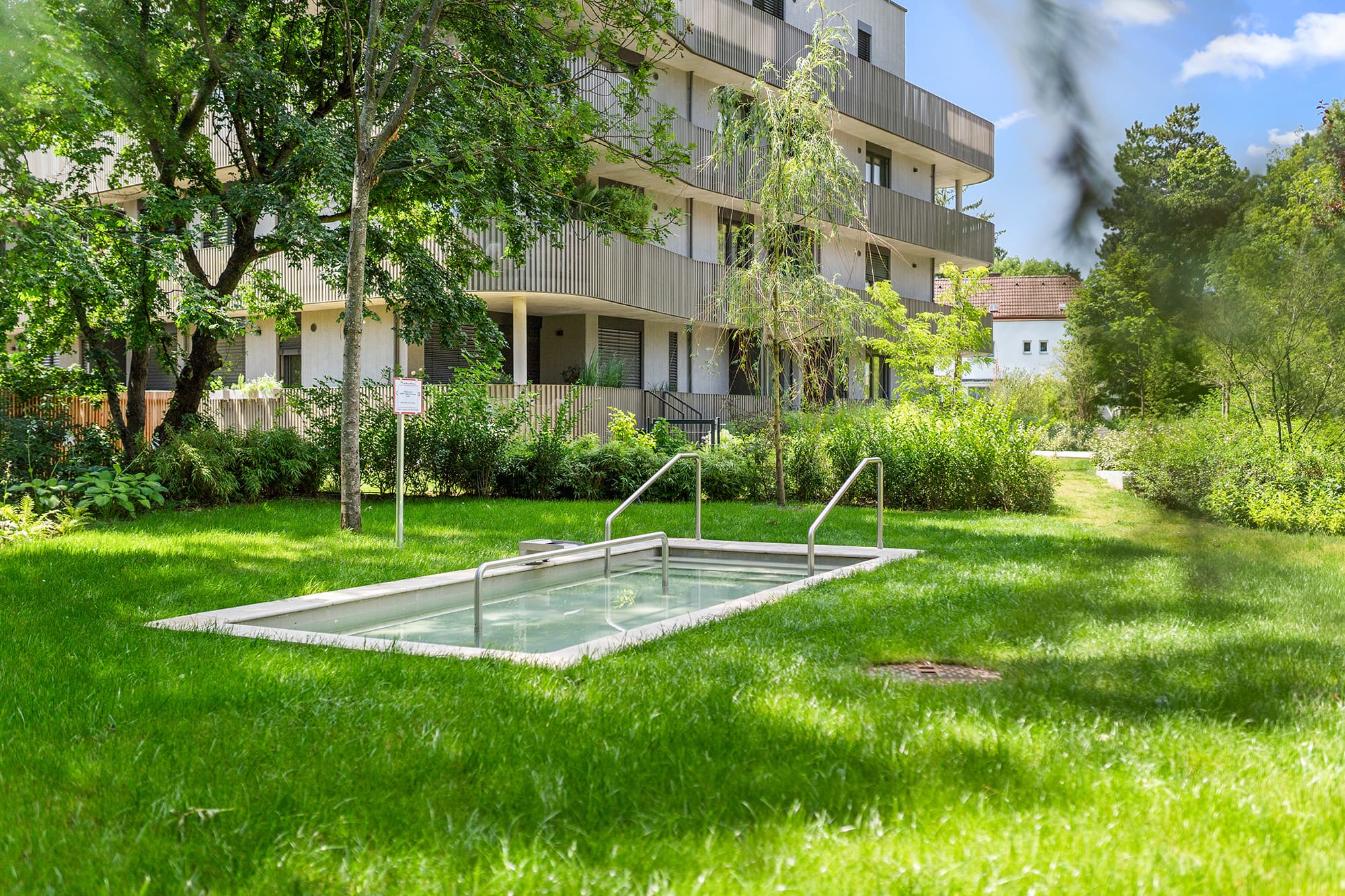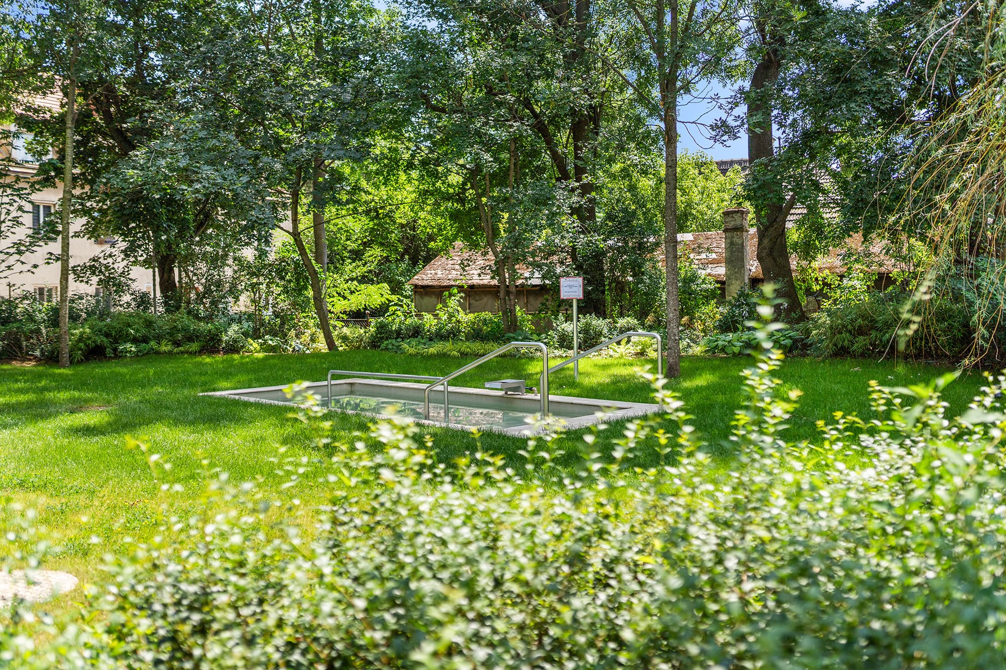 Features in the park // Kneipp basin // seating areas and picnic islands with stools and benches // vegetable garden with raised beds // ornamental garden // children's playground // dog zone