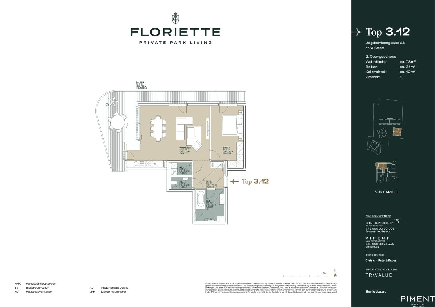 The apartments in the Floriette project are nestled in a magnificent 12,000 m² private park in the heart of Hietzing, one of the most sought-after and exclusive residential areas of Vienna. This extraordinary project features a total of 63 luxury apartments, divided between the impressive "Stadthaus Floriette" with classic old building charm and three elegant new villas (Villa Camille, Villa Rosa & Villa Flora) in modern, understated architecture with generous spaces and panoramic windows.