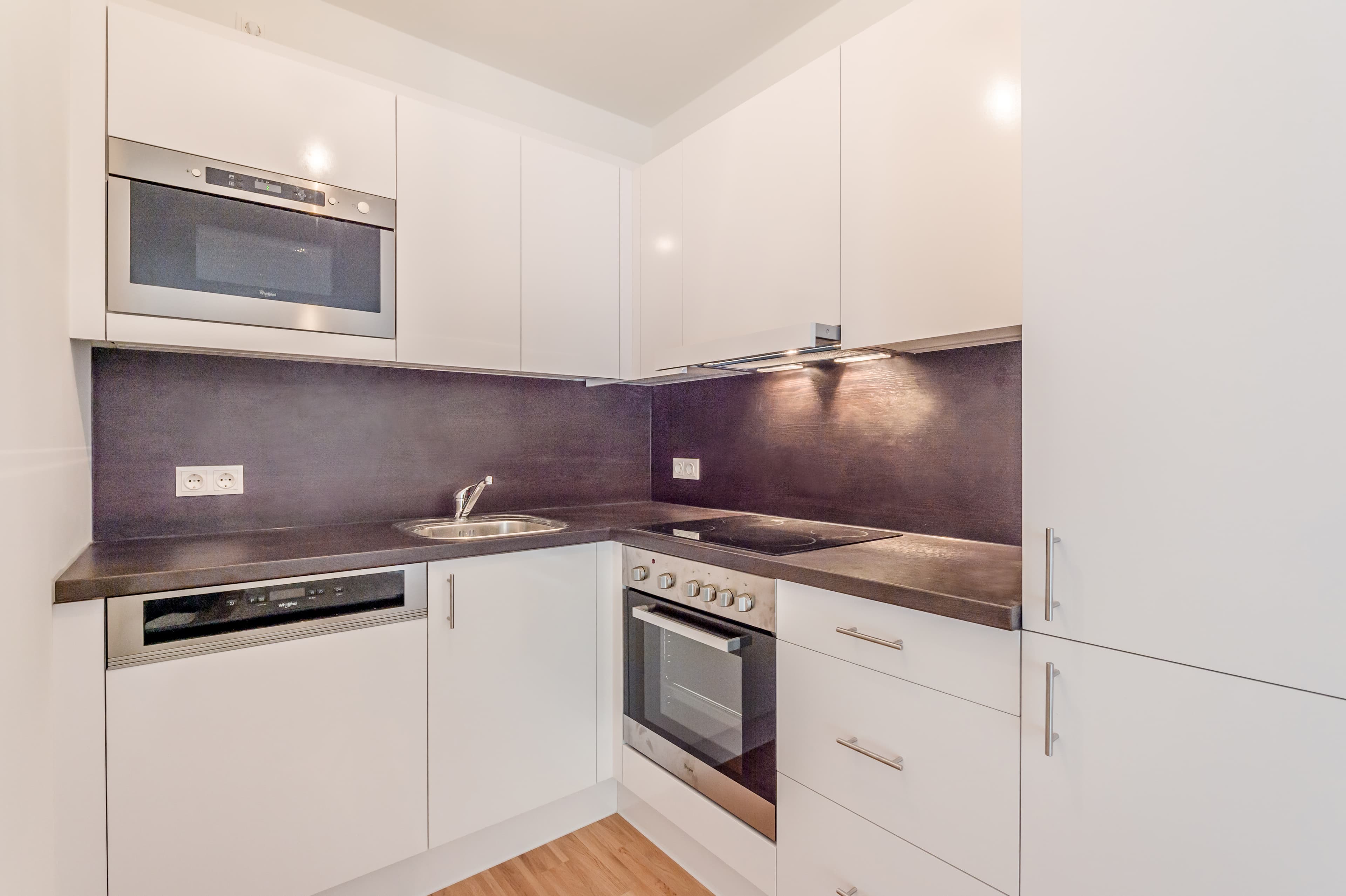 Features // Fully equipped kitchen including Whirlpool branded appliances (fridge, ceramic hob, oven, extractor hood, microwave, and stainless steel dishwasher) // Bathroom with fine porcelain tiles, integrated vanity, mirror, walk-in shower, towel radiator, and sanitary ware by Laufen // Ceiling spotlights in the bathroom and toilet // Weitzer oak parquet flooring // Underfloor heating // Thermally insulated wood-aluminum windows, triple-glazed with external shading // Entry security door // Video intercom system // Cable TV, in-house satellite system // Large balcony