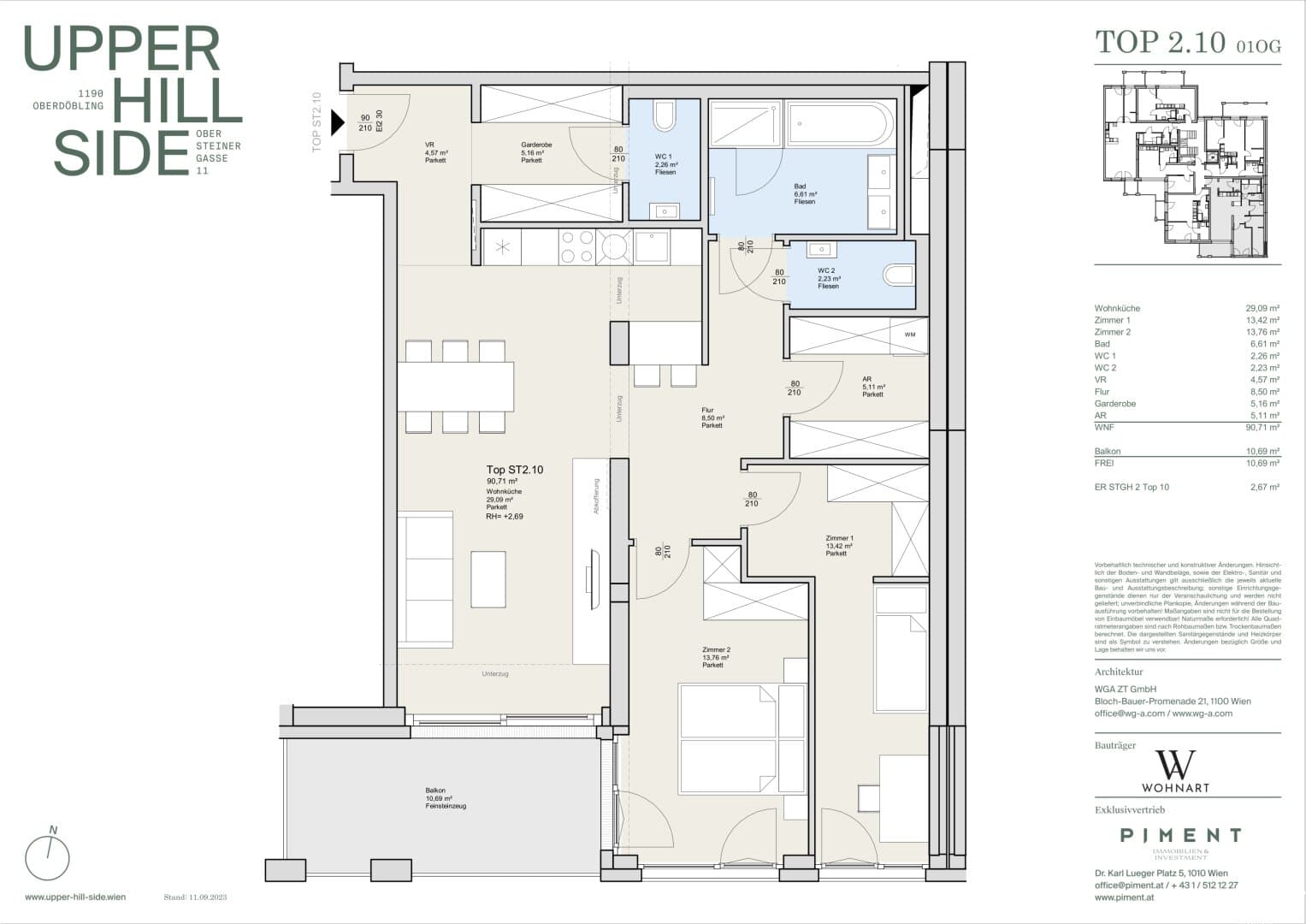 Room layout TOP 2.10, 1st floor // Entrance hall // Cloakroom // WC 1 // Livingroom/ kitchen // Bathroom (with double sink, shower, and bathtub) // WC 2 // Storage room // Bedroom 1 // Bedroom 2 // Balcony