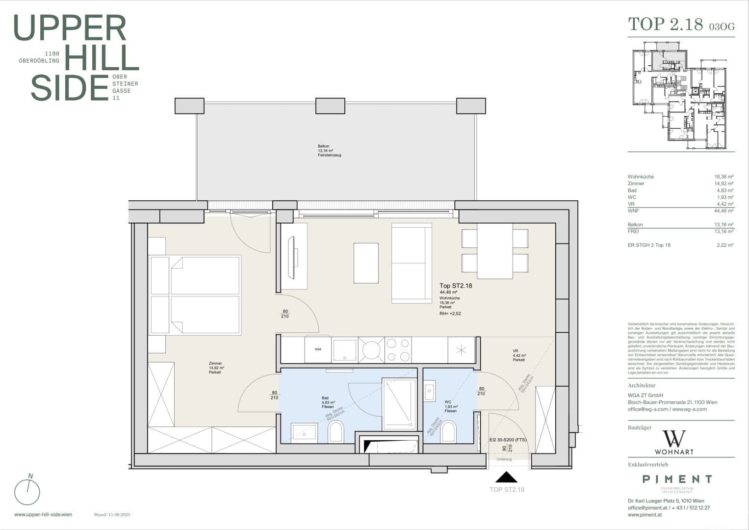 Room layout and amenities TOP 2.18, 3rd floor // Entrance hall // WC // Living room and kitchen (customised kitchen, fully equipped including Siemens appliances) // Bedroom // Bathroom (with sink, shower) // Balcony