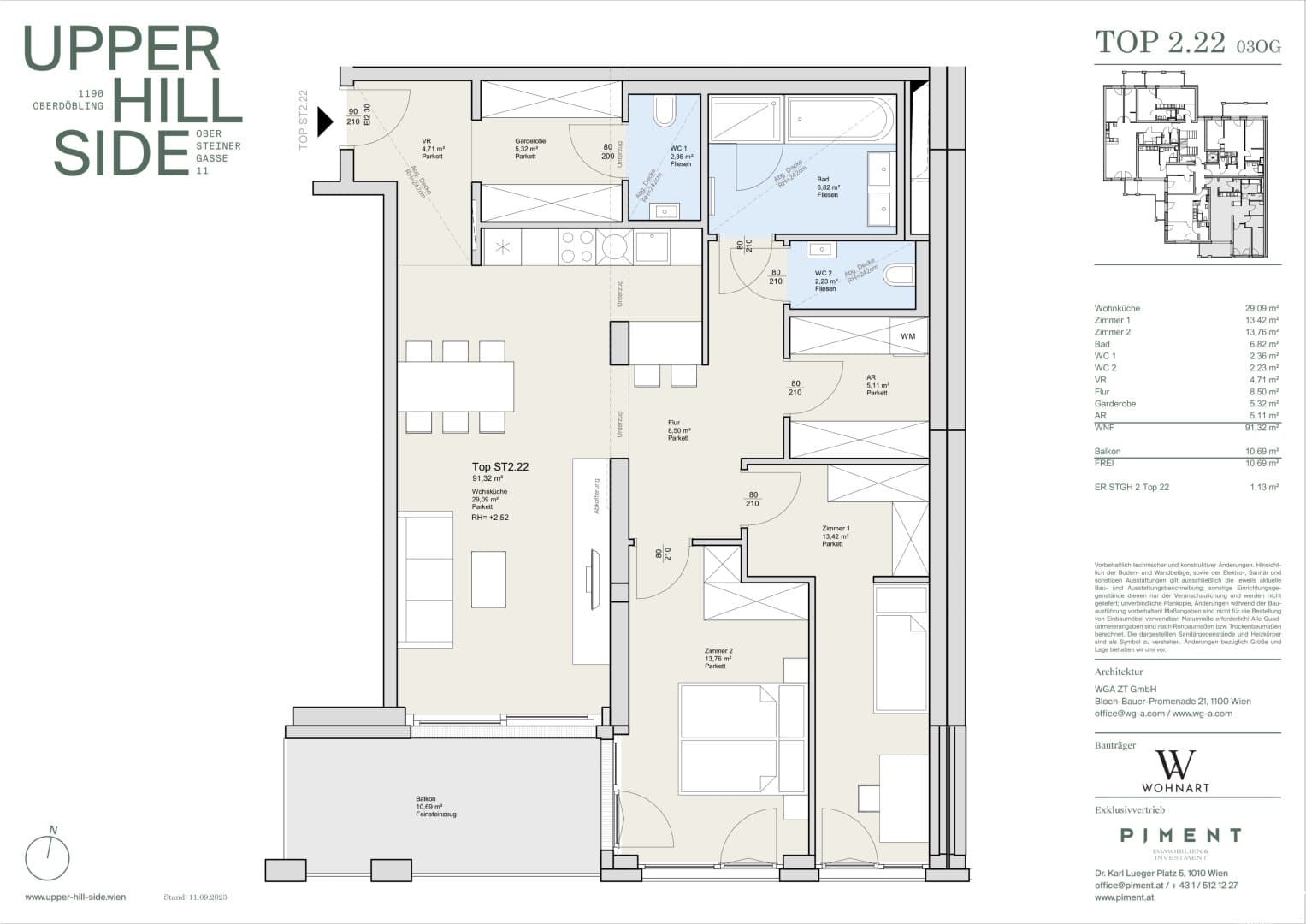 Room layout TOP 2.22, 3rd floor // Entrance hall // Wardrobe // WC 1 // Living room - kitchen // Bedroom 1 // Bedroom 2 // Storage room // WC 2 // Bathroom (with double sink, shower, and bathtub) // Balcony
