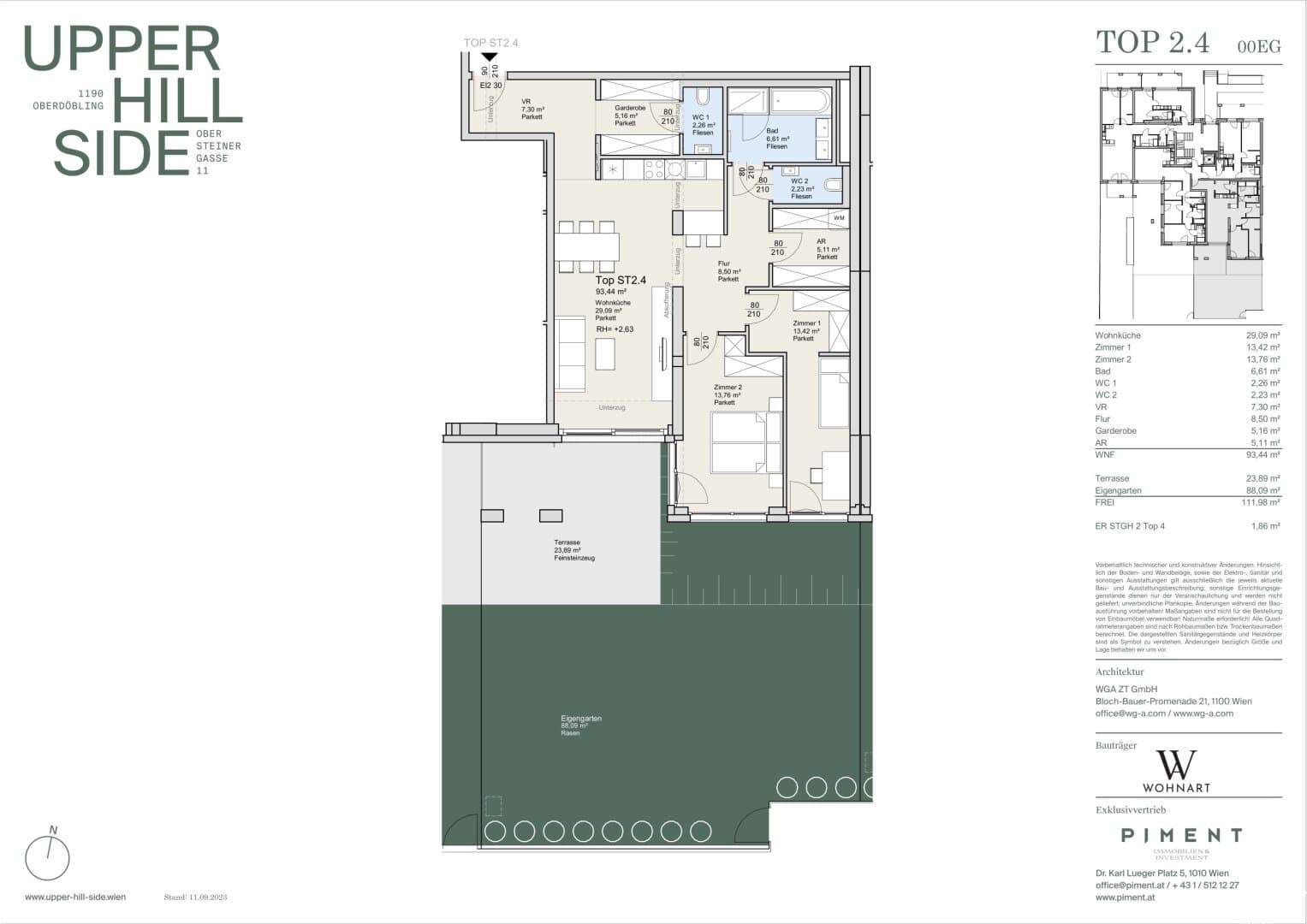 Room layout TOP 2.4, garden apartment // Entrance hall // Wardrobe // WC 1 // Living room/kitchen // Storage room // WC 2 // Bathroom (with double sink, shower, and bathtub) // Bedroom 1 // Bedroom 2 // Terrace and private garden