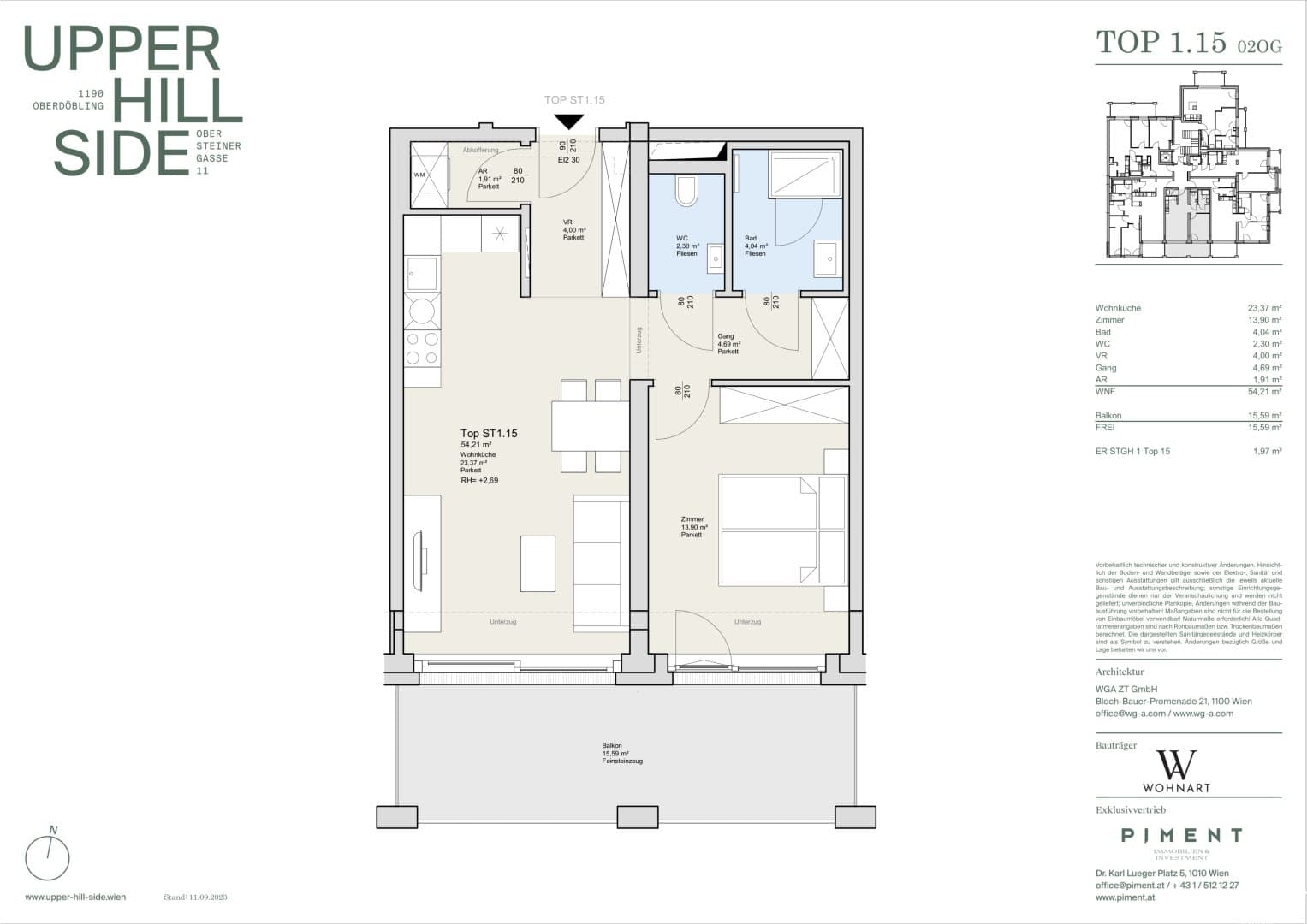 Room layout TOP 1.15, 2nd floor // Entrance hall // Storage room // Living room and kitchen // WC // Bathroom (with sink and shower) // Bedroom // Balcony