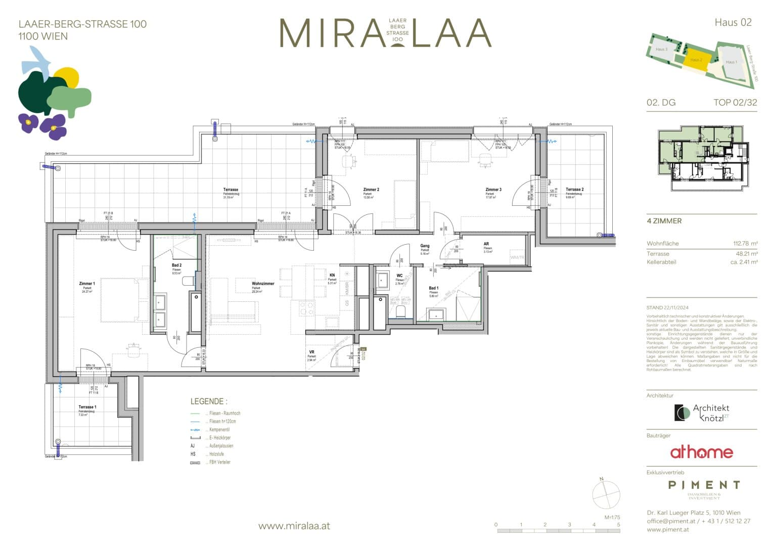 Das Park-Ensemble am Laaer Berg "MIRA LAA" mit seinen 54 Eigentumswohnungen entfaltet sich mitten im neuen Stadtviertel Viola Park als ein gehobenes Refugium der Vielfalt: Für alle Stadtliebhaber, die auch gerne schnell zu Fuß in der Natur sein wollen und Aussicht lieben.