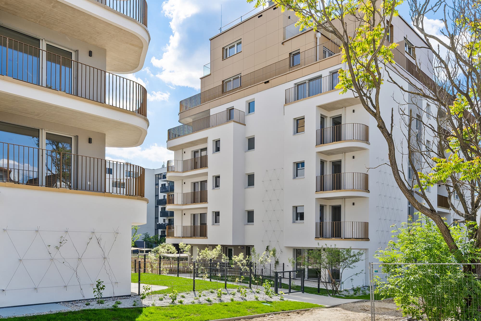 Die weißen Sockelfassaden sind von markanten Außenpunkten, floral geschwungenen Balkonen und Loggien, geprägt - die Dachgeschosse von weitläufigen Terrassen, mit weiten Ausblicken. Im Erdgeschoss setzen Eigengärten ein grünes Zeichen und mit dem direkt angrenzenden Kleingartenverein auf gute Nachbarschaft.