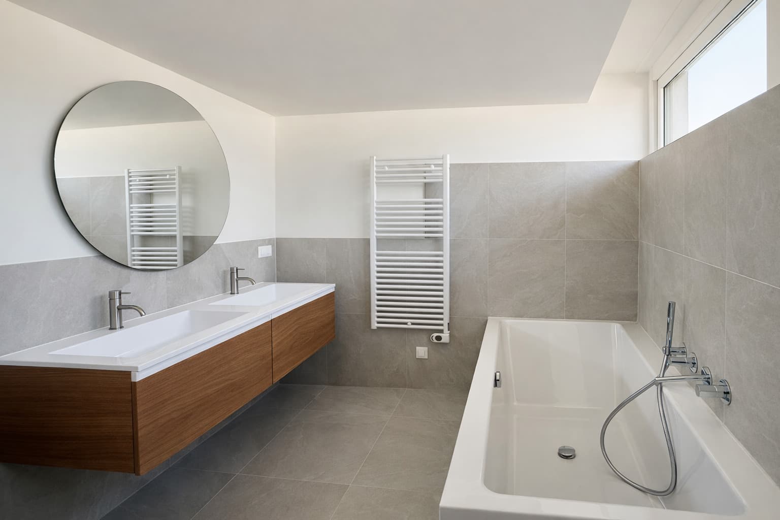// Vorraum // Abstellraum // Gäste-WC // Wohnküche // Tageslicht-Badezimmer mit Badewanne, Doppelwaschbecken und weiterem WC // Garderobe // Zimmer 1 // Zimmer 2 // Zimmer 3 // Bad ensuite (mit bodenebener Dusche)