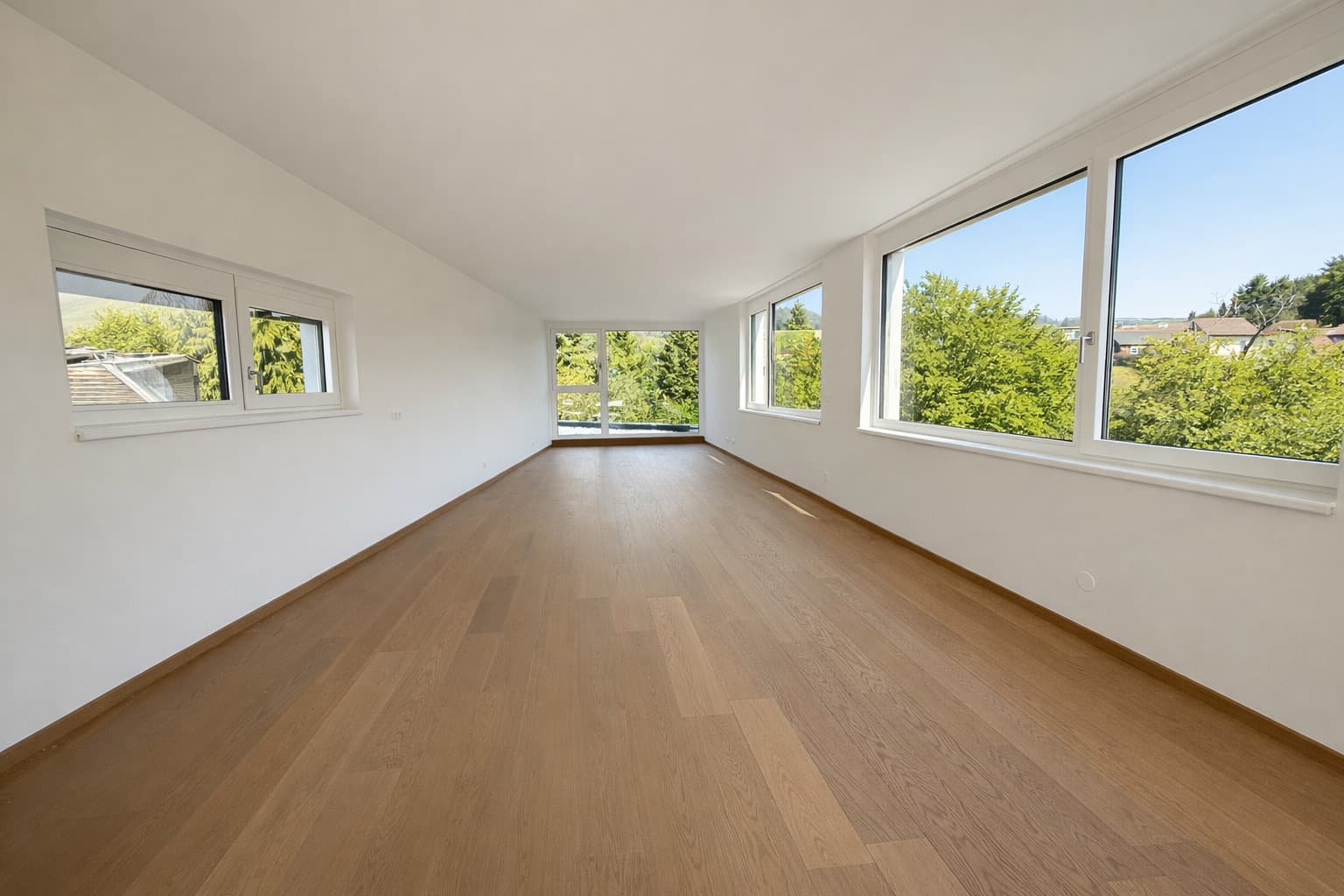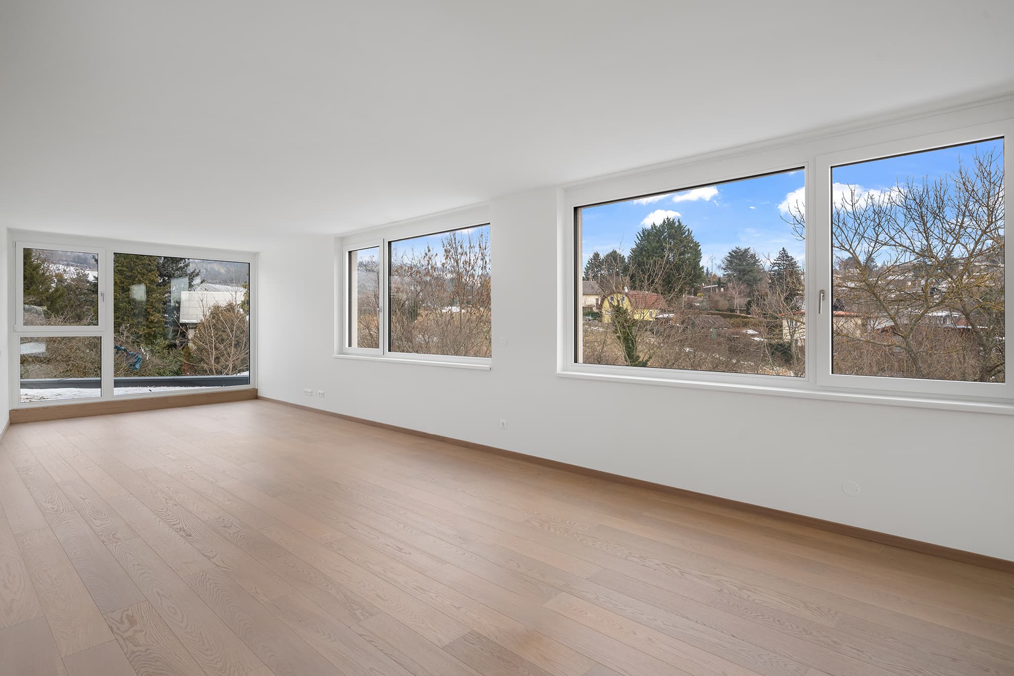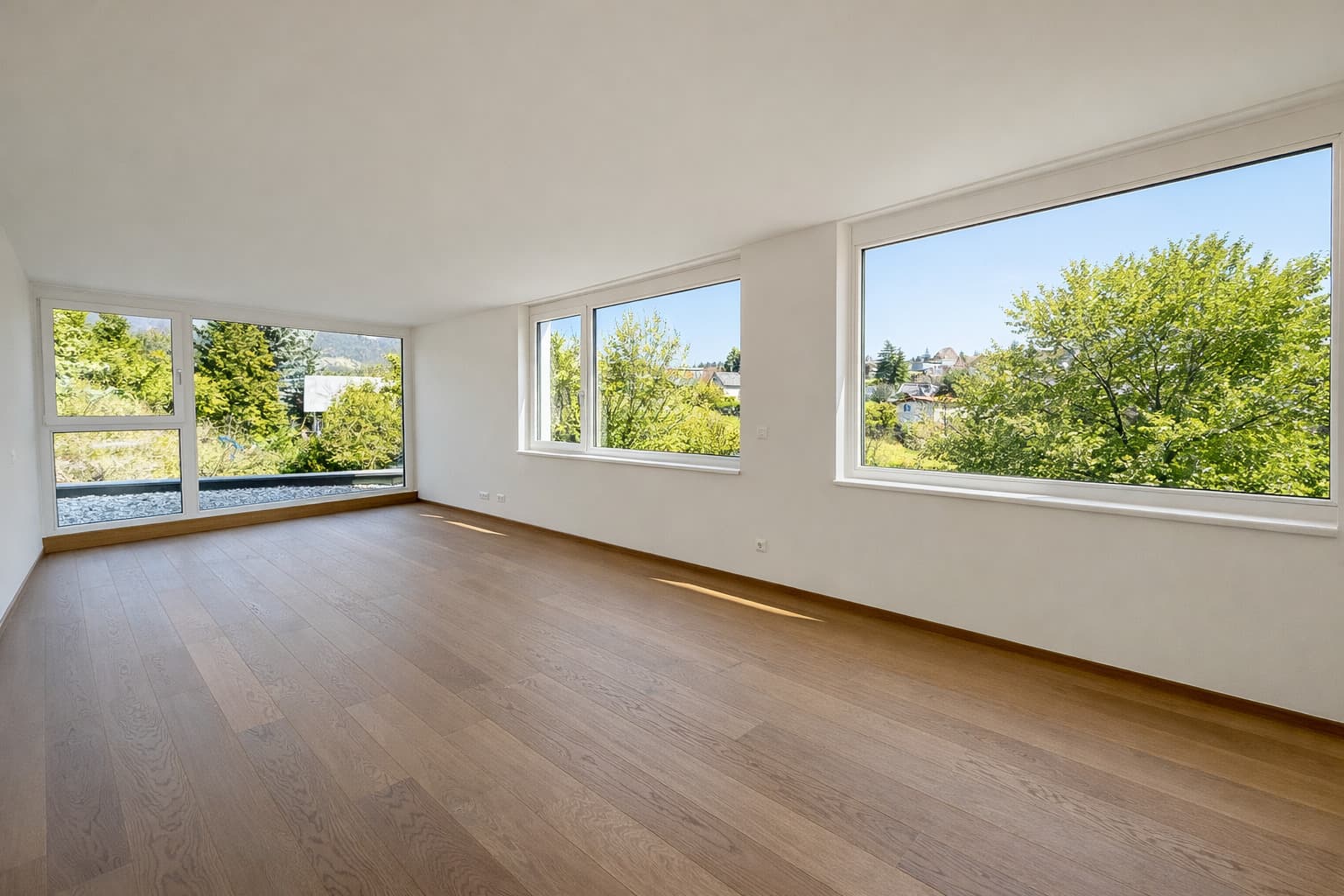 Die bodentiefen Fenster und Panoramafenster bilden einen fließenden Übergang zur malerischen Umgebung und erweitern den Raum nach Aussen. Im Inneren überzeugen die modernen Wohnräume durch das offene Raumkonzept, bei dem Wohnzimmer, Esszimmer und Küche nahtlos miteinander verbunden sind. Und auch hier reflektieren die hellen und pastellfarbenen Farbtöne der Wände, Decken und Böden das Licht.