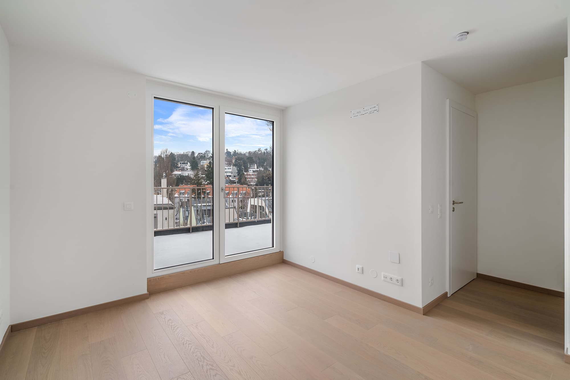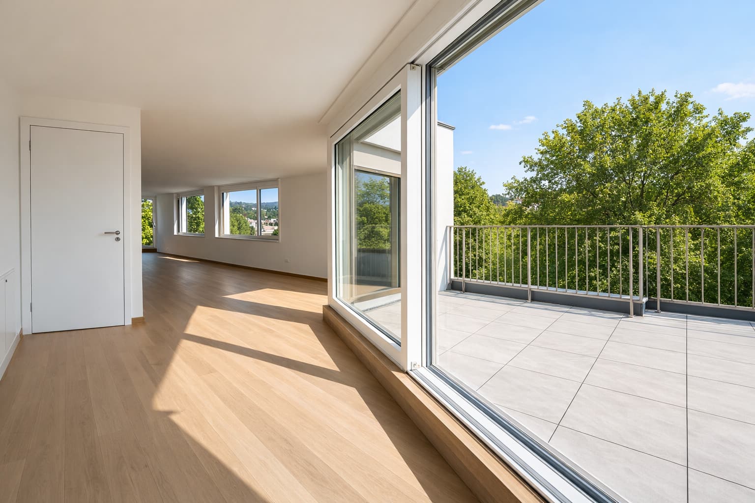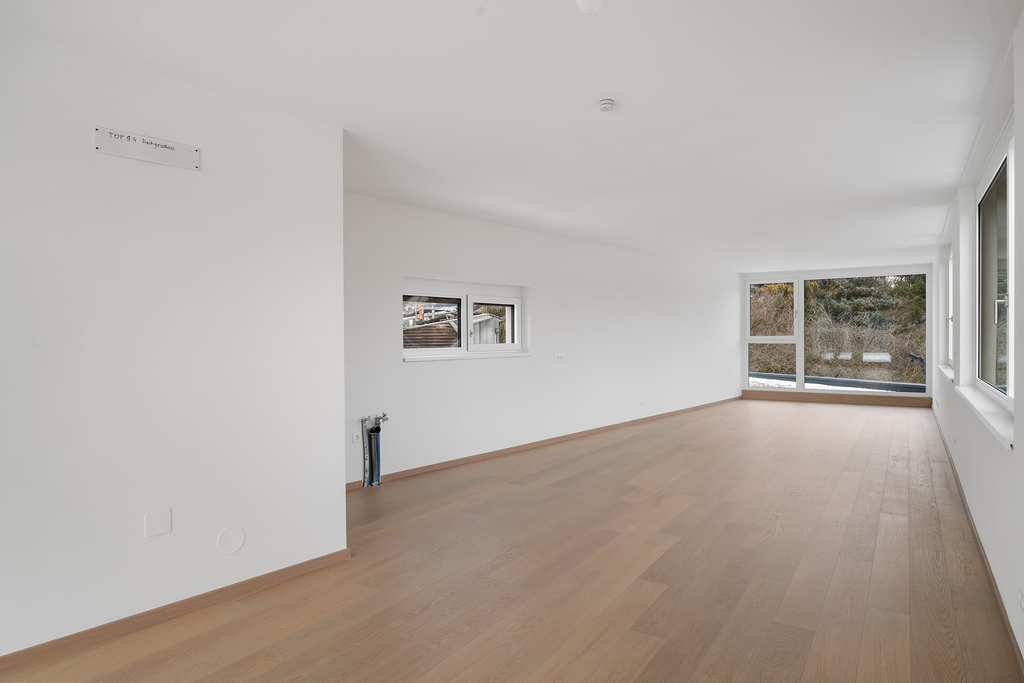 Die bodentiefen Fenster und Panoramafenster bilden einen fließenden Übergang zur malerischen Umgebung und erweitern den Raum nach Aussen. Im Inneren überzeugen die modernen Wohnräume durch das offene Raumkonzept, bei dem Wohnzimmer, Esszimmer und Küche nahtlos miteinander verbunden sind. Und auch hier reflektieren die hellen und pastellfarbenen Farbtöne der Wände, Decken und Böden das Licht.