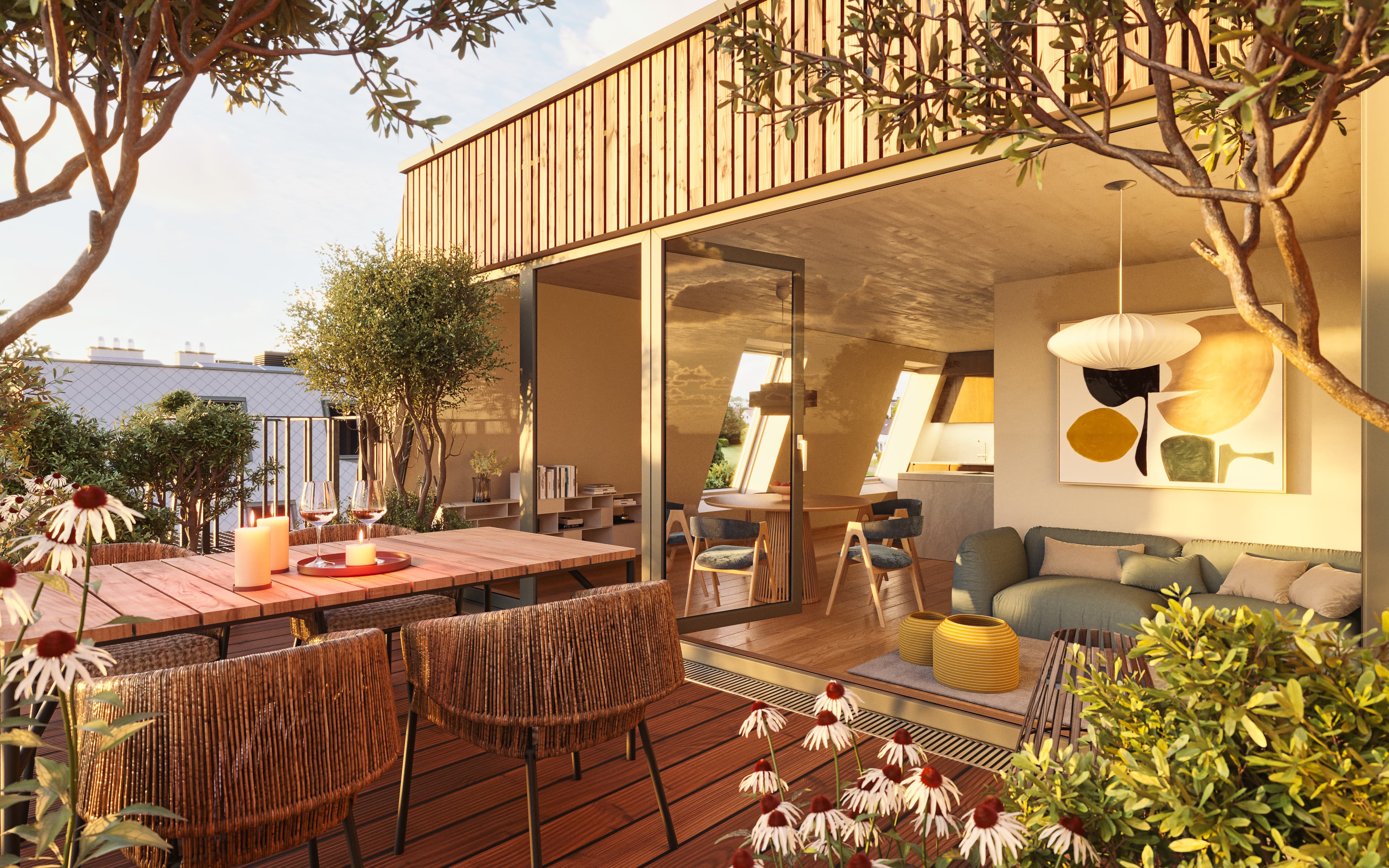 Der zentrale Gemeinschaftsgarten bietet nicht nur Raum für Begegnungen und Entspannung, sondern auch Platz für Urban Gardening: saisonal, regional und kommunikativ. Das „Garteln“ ergänzt unser Konzept zeitgemäßen Wohnens und lädt zum gemeinschaftlichen Pflanzen, Pflegen und Ernten ein. Die naturbelassenen Flächen und die harmonisch integrierten Gärten lassen Sie die Jahreszeiten und Zyklen der Natur spürbar erleben. Die Farbgestaltung orientiert sich an naturnahen Tönen, während die Holzfassade in den unteren Stockwerken durch eine Metallfassade bei den geneigten Wänden und Dachschrägen ergänzt wird. Innen dominieren weiß lackierte Holzoberflächen, die das naturnahe Ambiente unterstreichen.