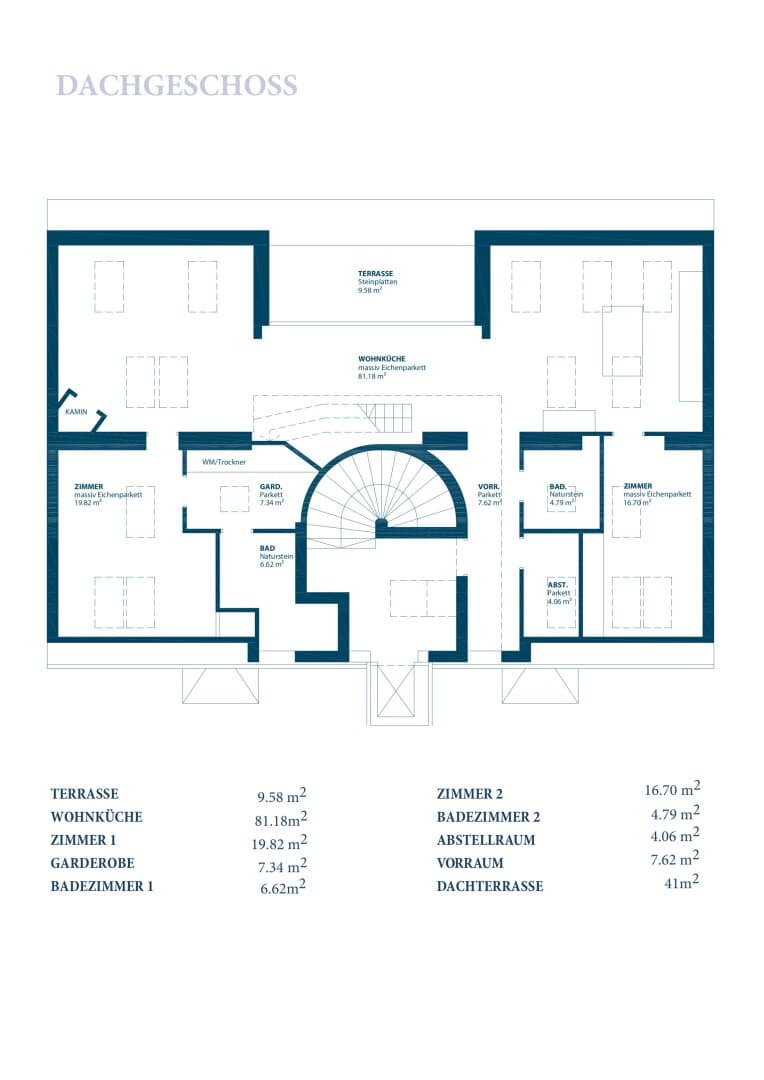 Raumaufteilung // Vorzimmer mit Kästchen // Abstellraum mit Regalsystem // offene Küche mit kompletter Einrichtung und Esstisch // Wohnzimmer mit offenem Kamin, Sofa // Schlafzimmer mit Bett und begehbarem Kleiderschrank // Büro mit Bürotisch und Einbaukasten // 2 Badezimmer mit Toilette // 2 Terrassen (1x auf Wohnebene)