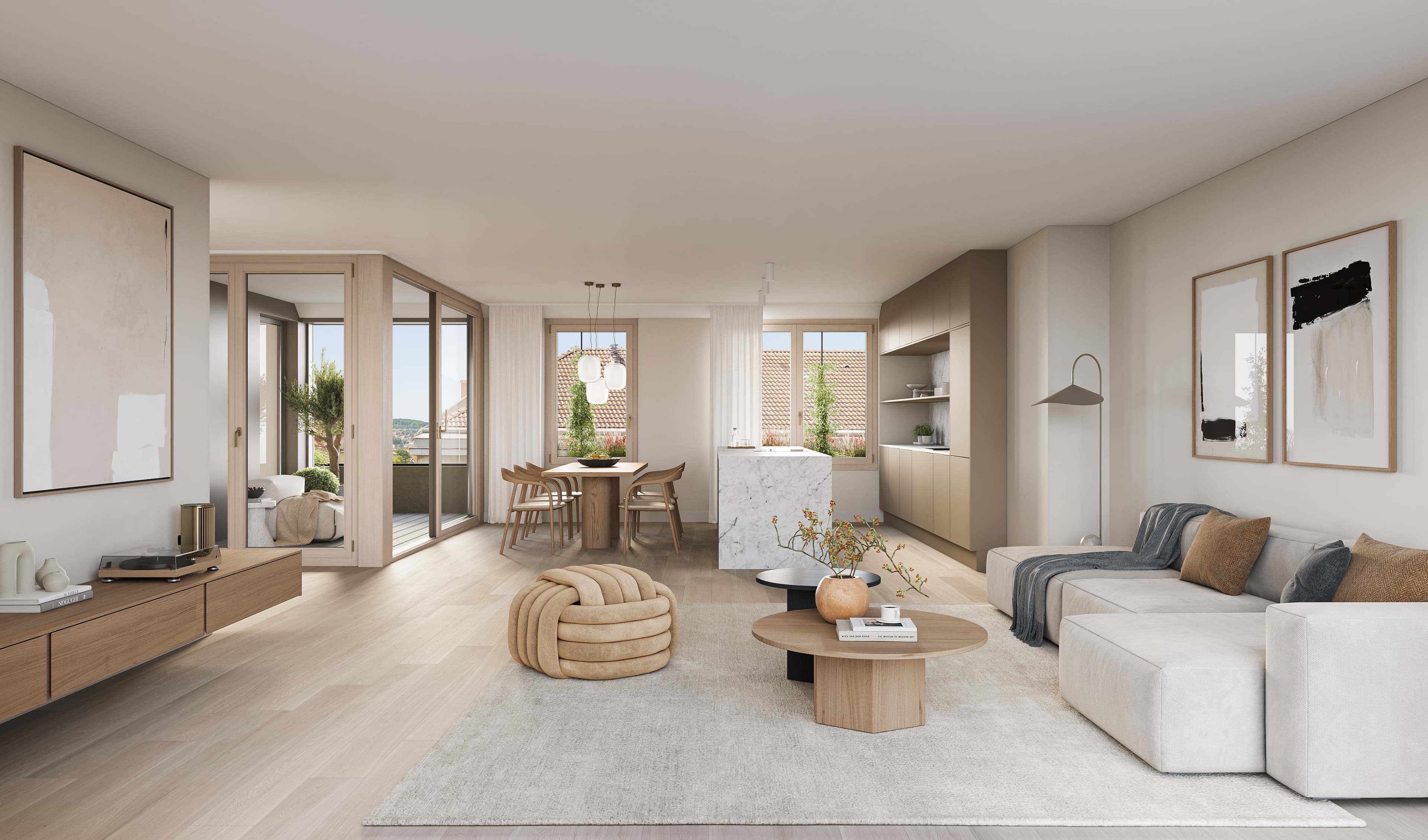 Die 14 exklusiven Wohneinheiten mit Flächen zwischen 36 und 137 m² bieten für jede Lebenssituation den passenden Rahmen. Jede Einheit verfügt außerdem über einen privaten Freiraum – sei es eine Loggia, ein Balkon oder eine großzügige Terrasse. Ein besonderes Augenmerk wurde auf die Materialität gelegt: Ein ausgewogener Materialmix aus Bronze, hochwertiges Feinsteinzeug und warmen Naturfarben prägt den Charakter des Gebäudes – denn wahre Eleganz liegt in der perfekten Balance.