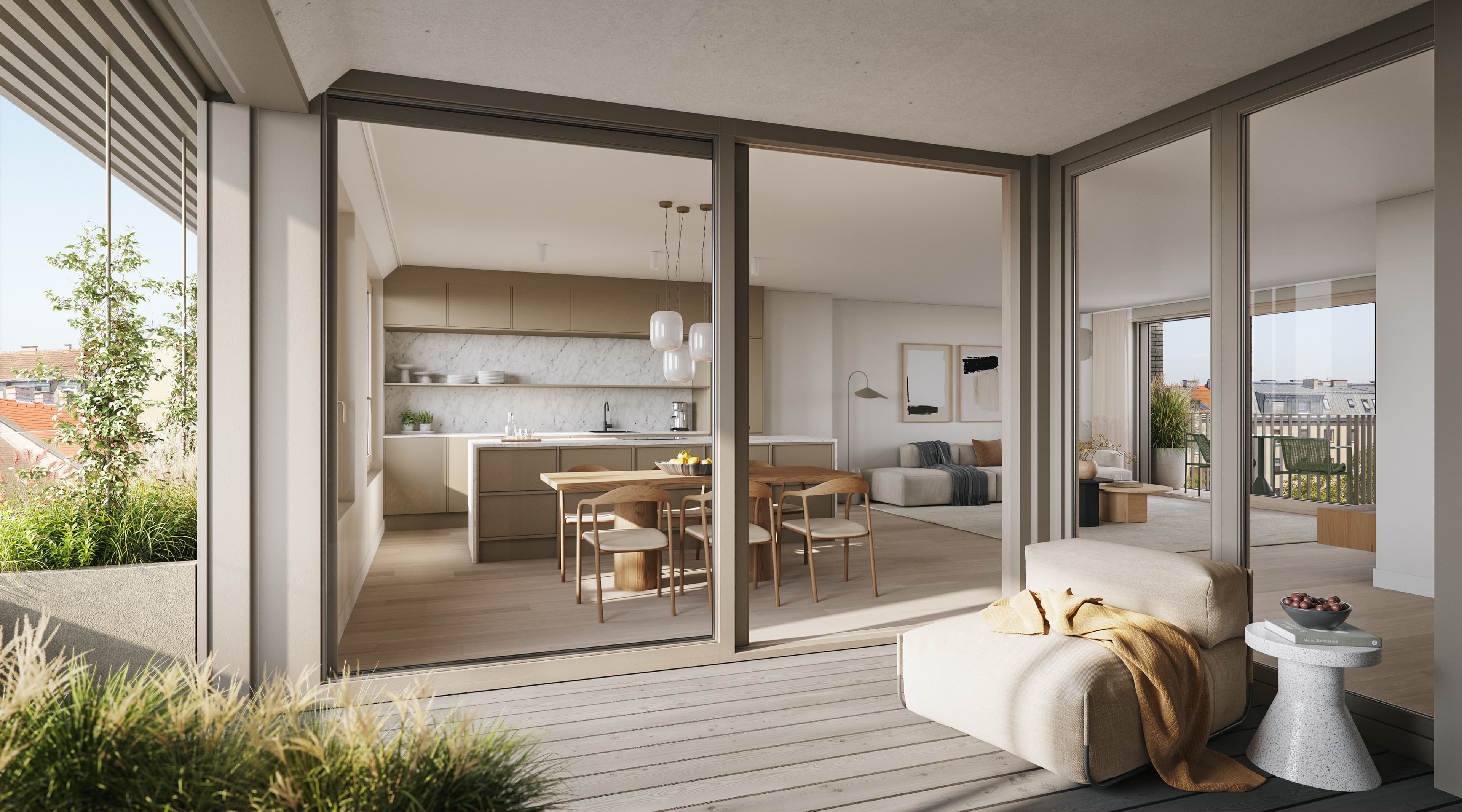 Die 14 exklusiven Wohneinheiten mit Flächen zwischen 36 und 137 m² bieten für jede Lebenssituation den passenden Rahmen. Jede Einheit verfügt außerdem über einen privaten Freiraum – sei es eine Loggia, ein Balkon oder eine großzügige Terrasse. Ein besonderes Augenmerk wurde auf die Materialität gelegt: Ein ausgewogener Materialmix aus Bronze, hochwertiges Feinsteinzeug und warmen Naturfarben prägt den Charakter des Gebäudes – denn wahre Eleganz liegt in der perfekten Balance.