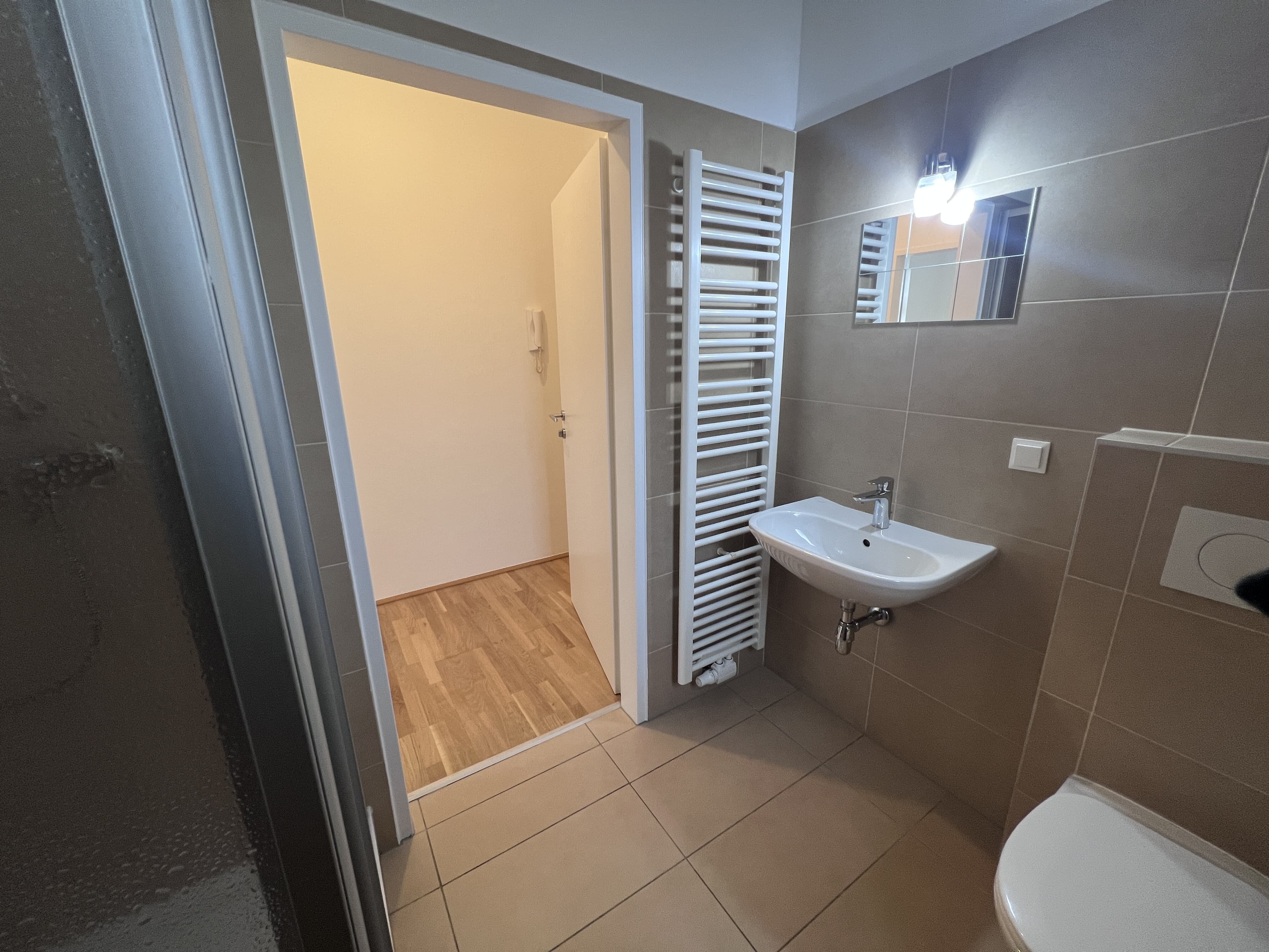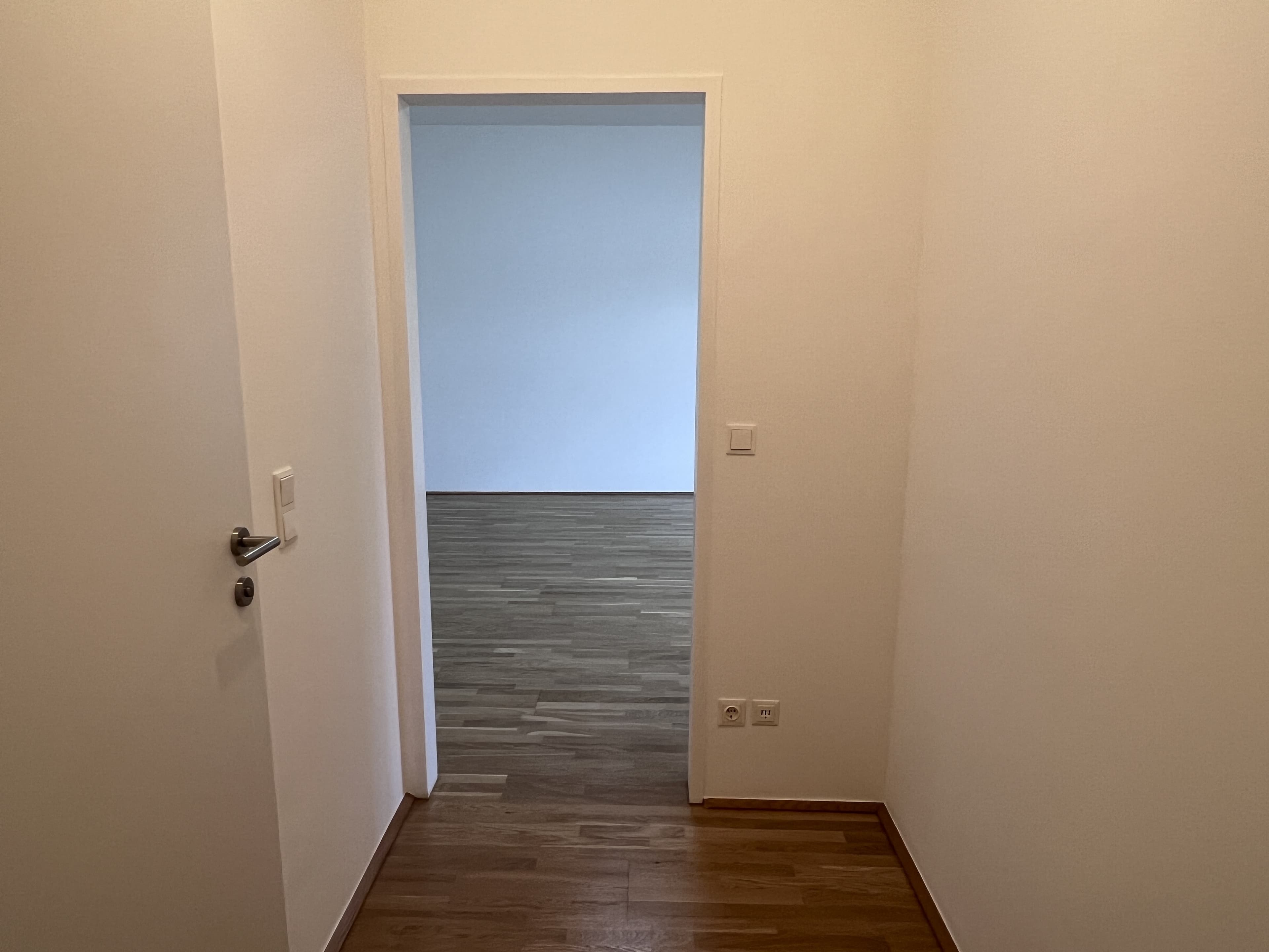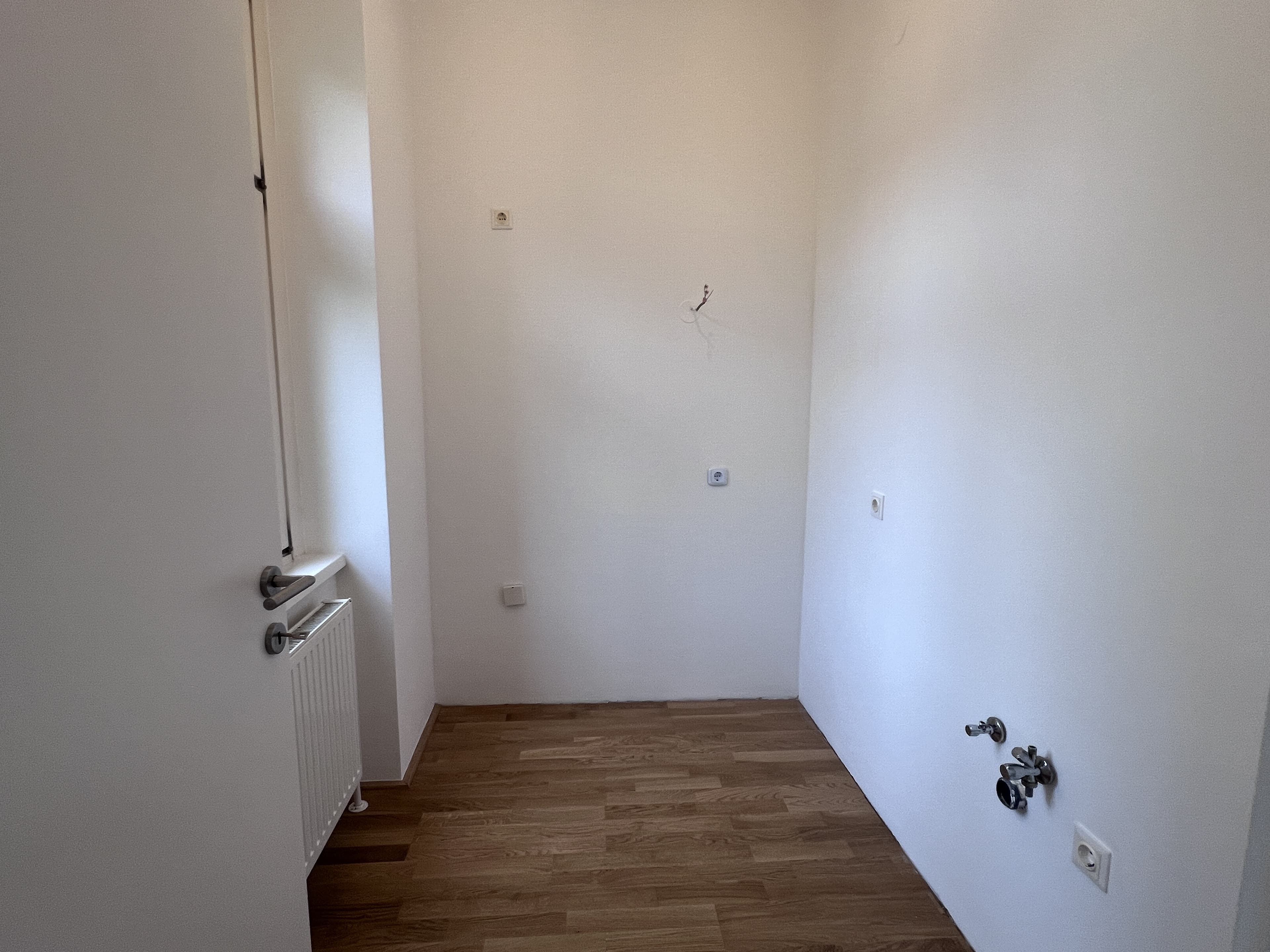 Raumaufteilung // Vorzimmer // Kochnische mit Türe - keine Küche eingebaut - Küchenanschlüsse sind vorbereitet - für Herd und Abwasch können bei der ersten Miete € 400 einbehalten // Wohn/Ess/Schlafzimmer // Badezimmer mit WC