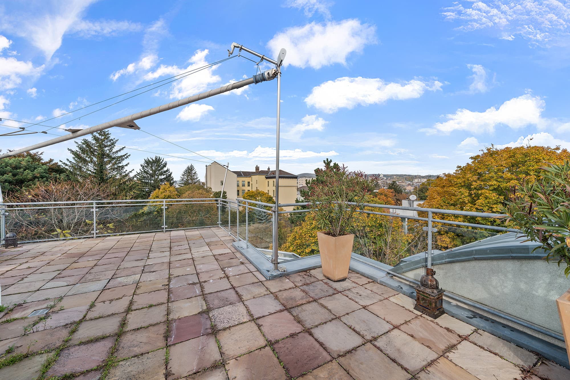 // Balkon auf Wohnebene // Große Dachterrasse mit Sonnensegel, Außendusche & Glashaus