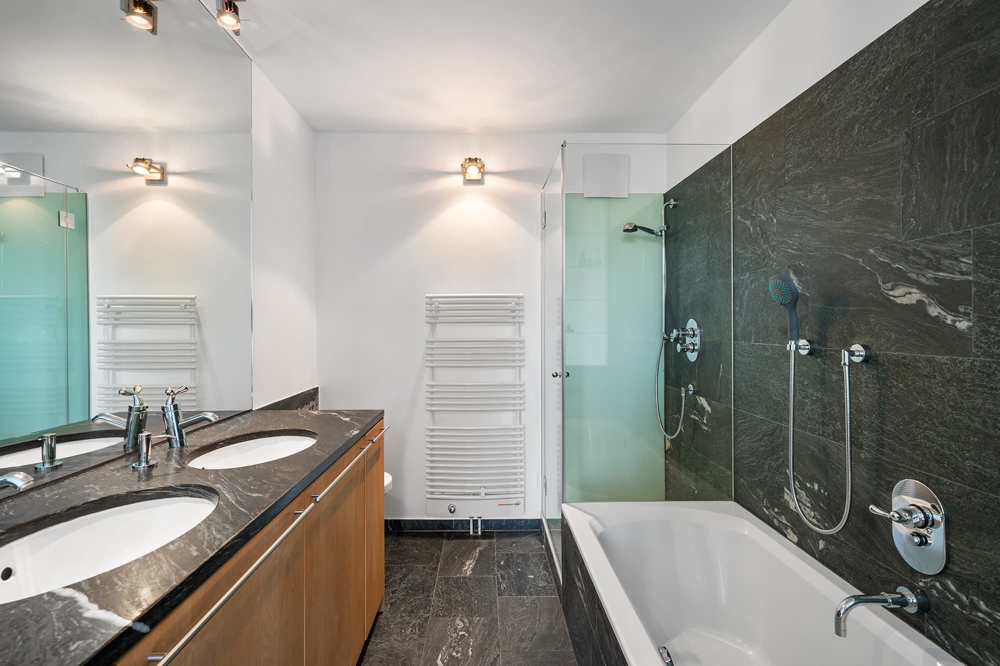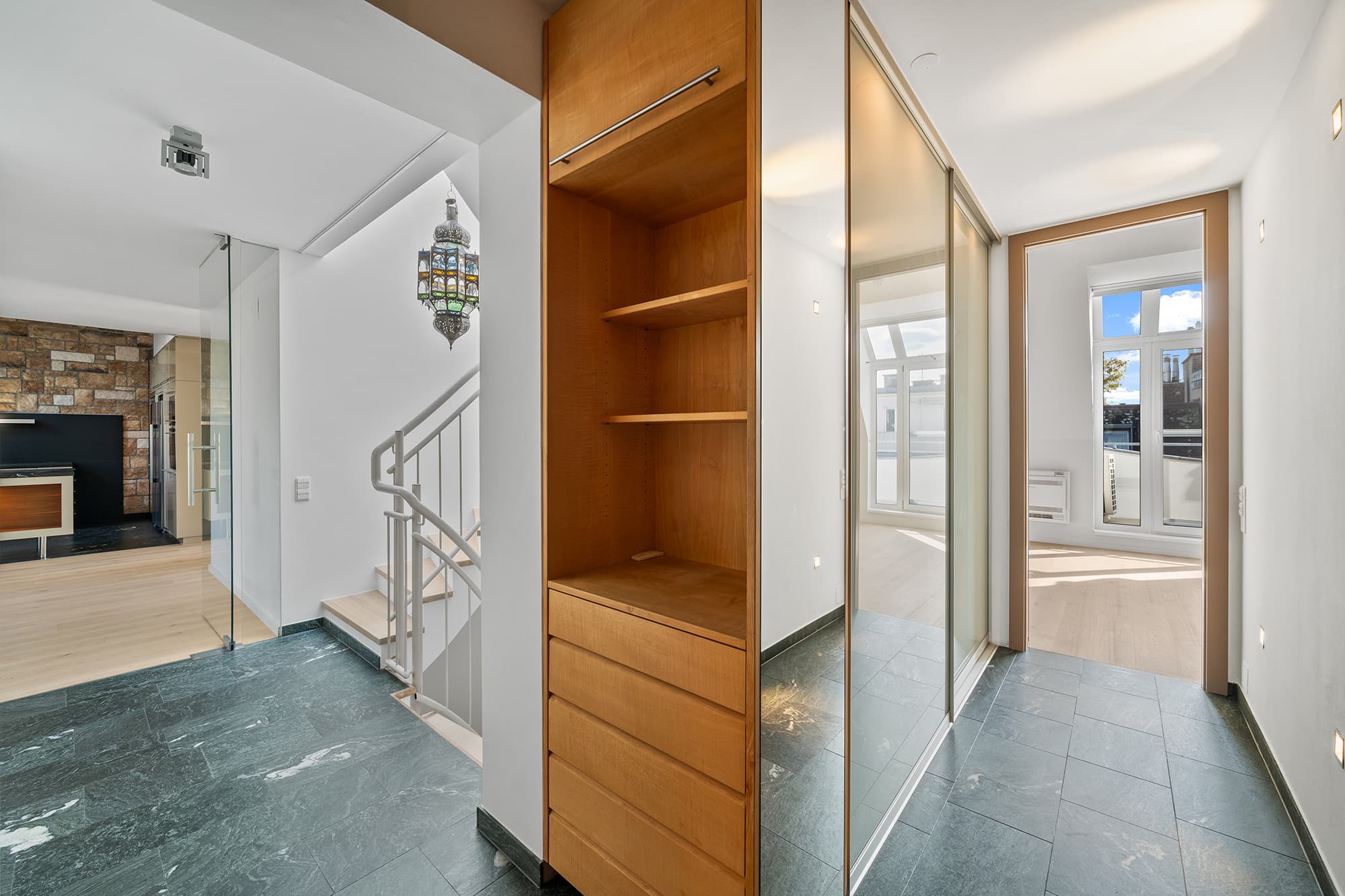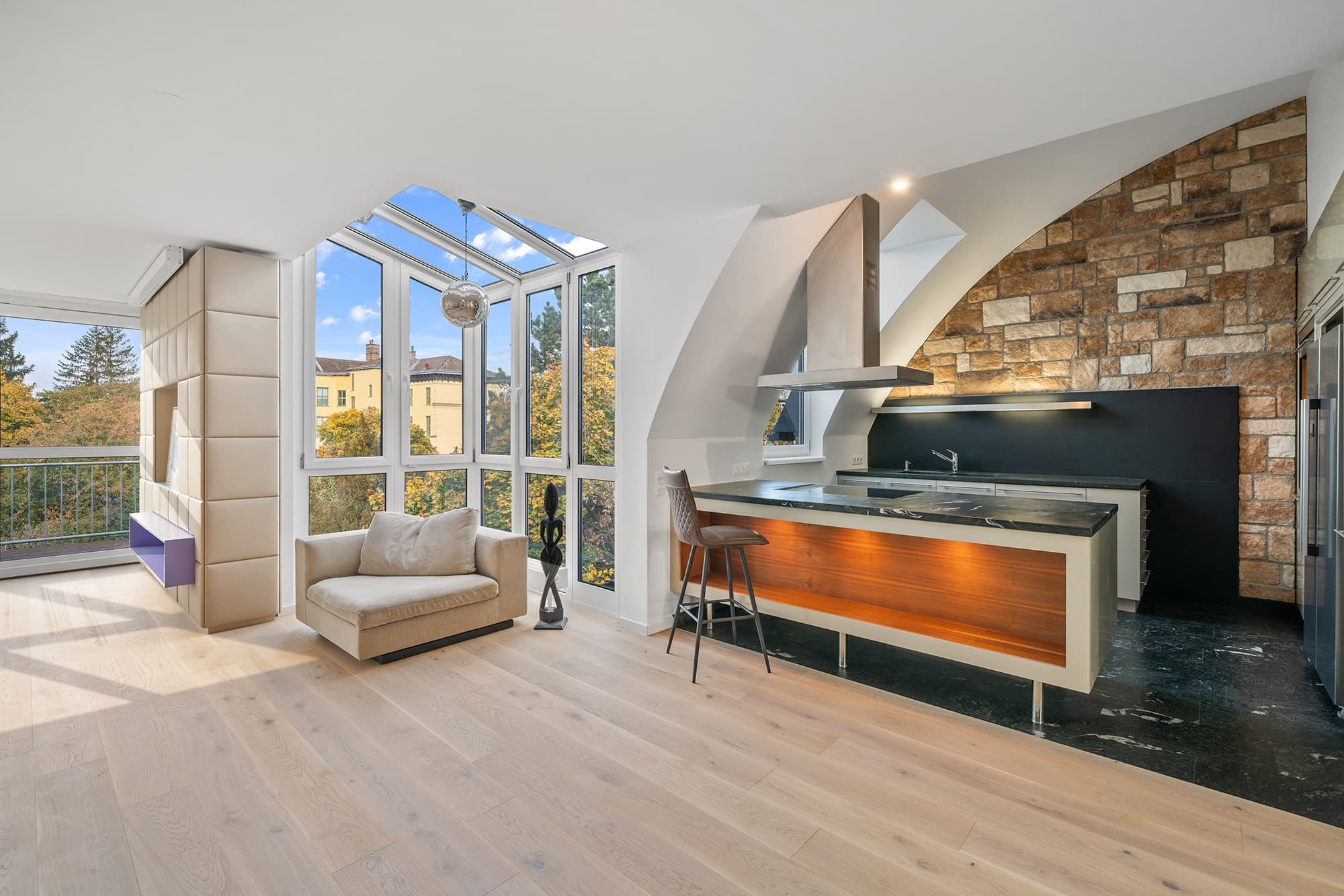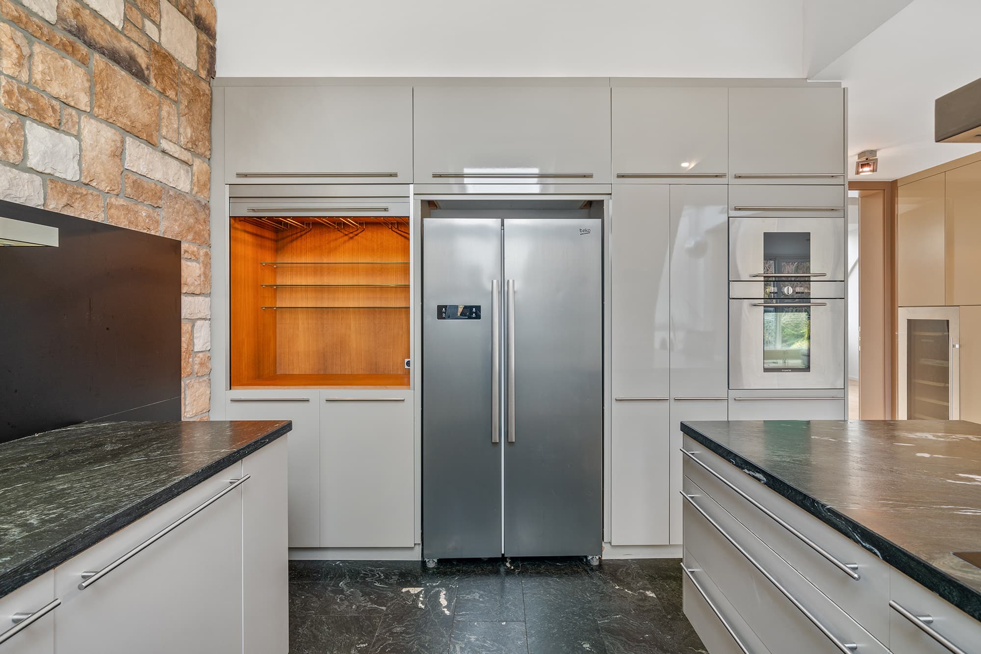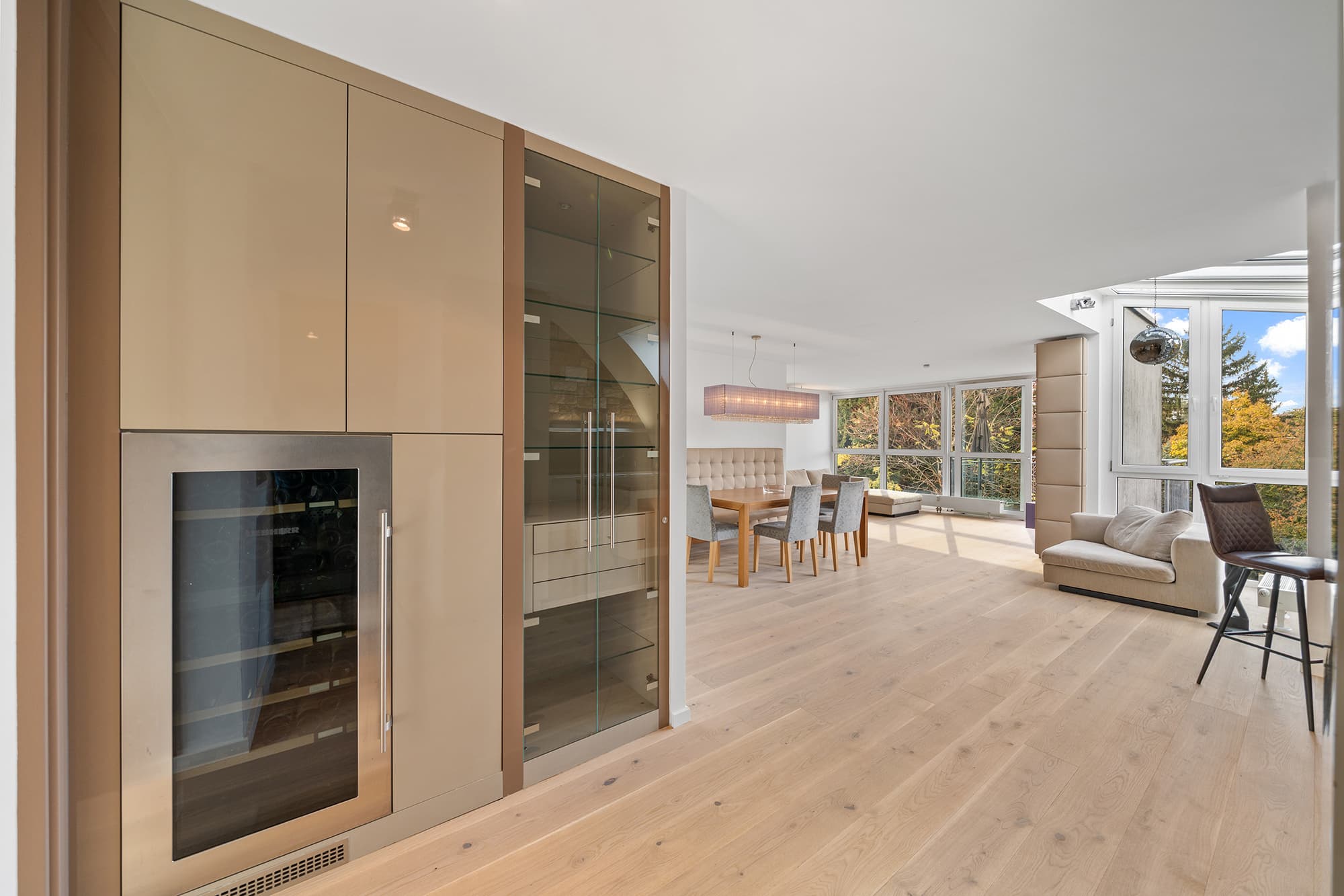 AUSSTATTUNG // Raumhohe Innentüren // Tischler-Küche mit Natursteinarbeitsplatte // Weinkühlschrank // Einbauschränke // Eichen Dielenboden // Naturstein in den Sanitärbereichen // Klimaanlage in den Schlafzimmern