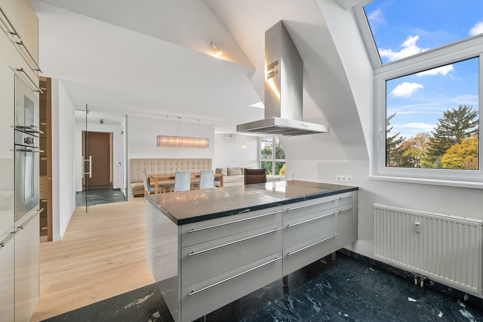 Die 5-Zimmer-Wohnung besticht durch eine großzügige Raumaufteilung, helle Wohnbereiche und eine weitläufige Dachterrasse, die einen traumhaften Grünblick über Hietzing bietet. Große Fensterflächen und Raumhöhen von bis zu 3,50 m lassen viel Tageslicht einfallen und schaffen eine offene, einladende Wohnatmosphäre.