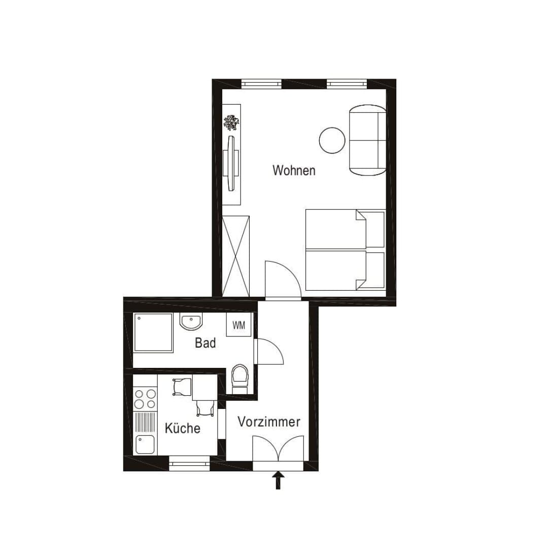 Zur Vermietung gelangt eine großzügig geschnittene 1,5 Zimmer-Wohnung. Raumaufteilung // Vorraum // Küche mit Gangfenster // Wohnzimmer // Badezimmer mit Dusche und WC