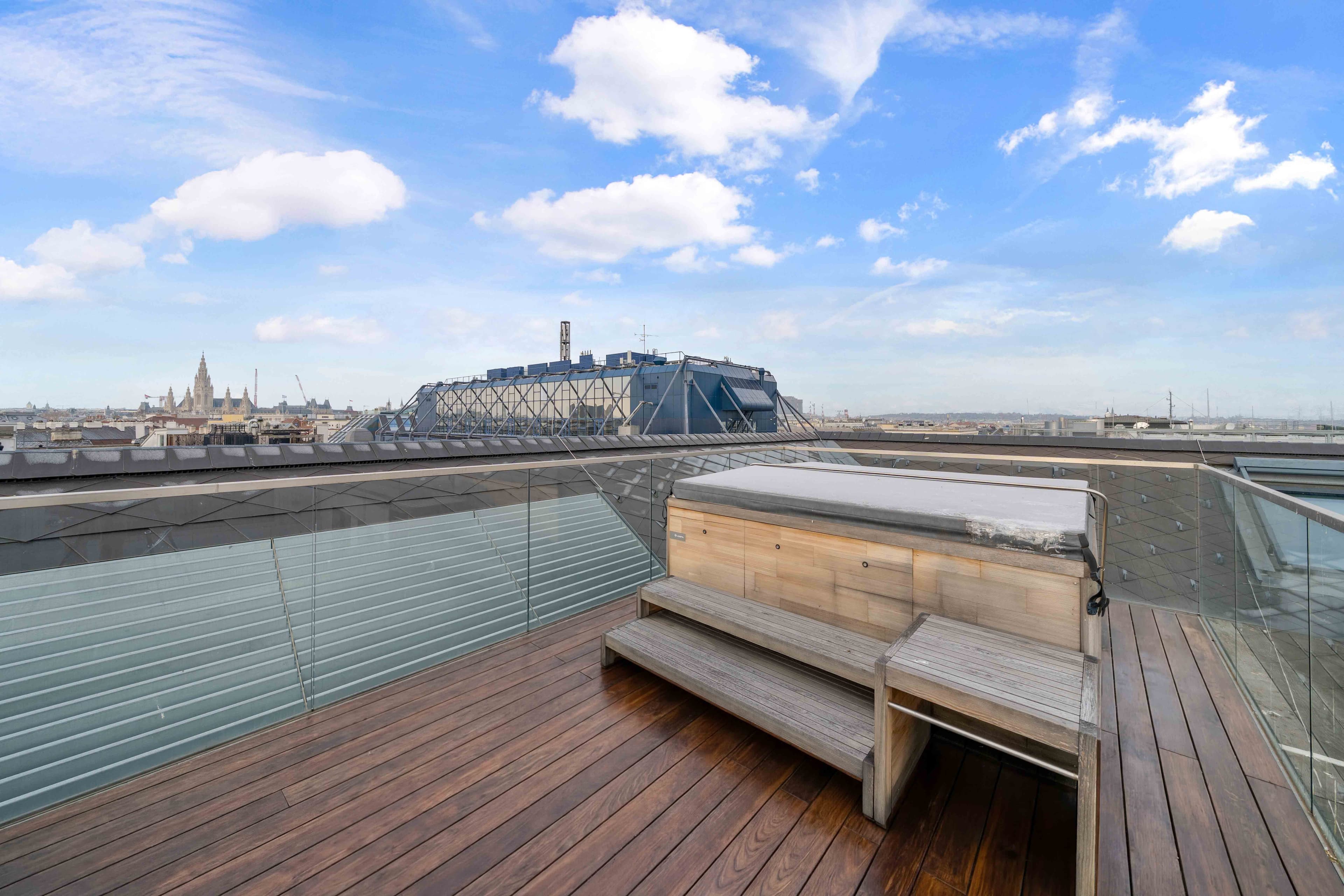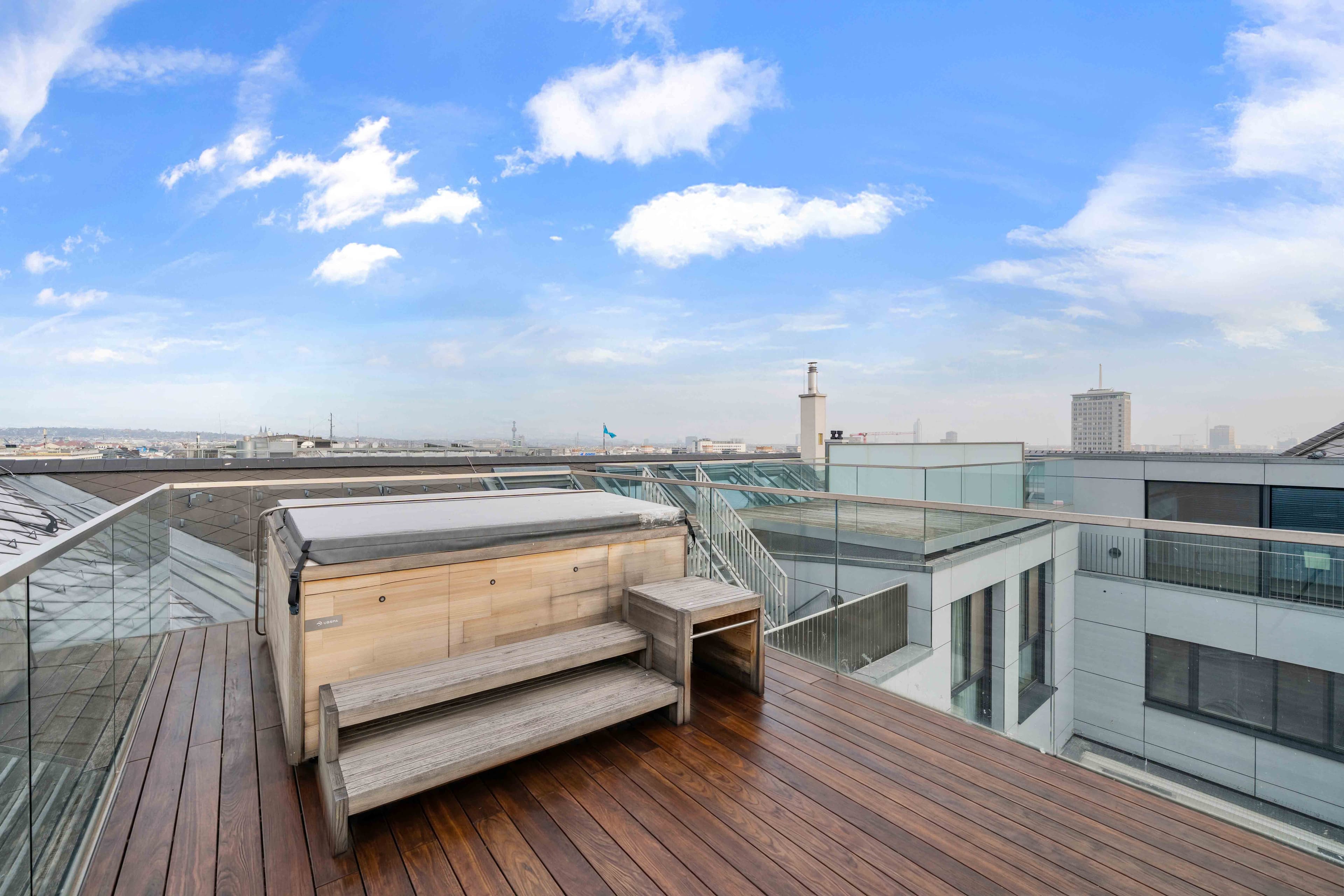 Ergänzt wird das Raumangebot durch einen Galerieebene mit Ausgang auf die Terrasse, die den Wohnraum ins Freie erweitert. Ein absolutes Highlight stellt die Dachterrasse mit Whirlpool dar – ein privater Rückzugsort über den Dächern der Stadt.