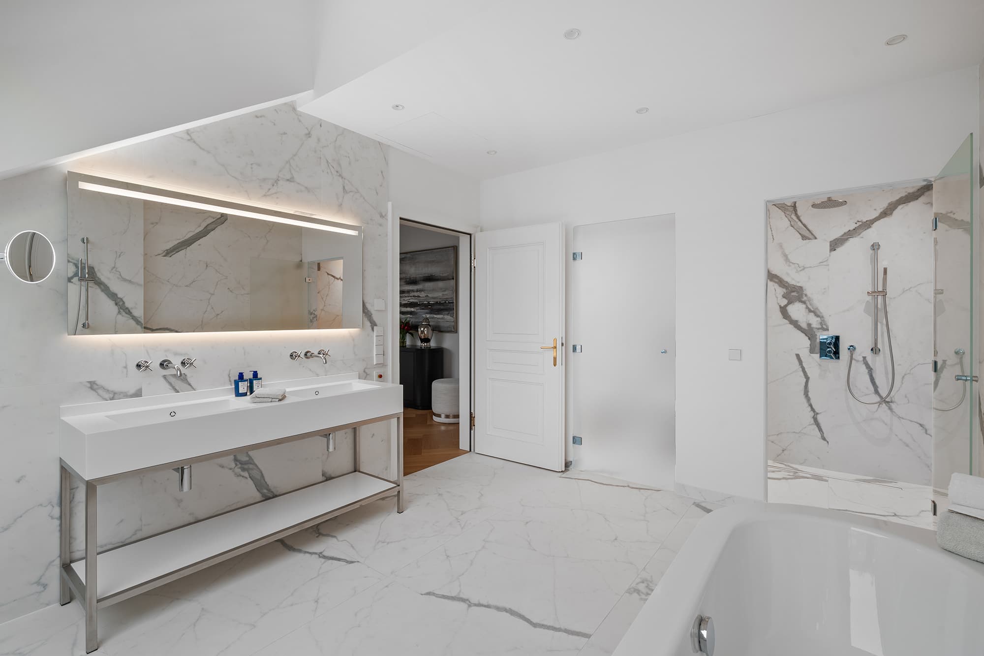 Der offene Wohn- und Essbereich mit integrierter Küche bildet das repräsentative Zentrum der Wohnung. Das großzügige Master-Schlafzimmer verfügt über ein elegantes Bad en Suite und bietet einen privaten Rückzugsort von besonderer Qualität. Ein weiteres Schlafzimmer mit eigenem Badezimmer eignet sich perfekt als Gäste-, Kinder- oder Arbeitszimmer.