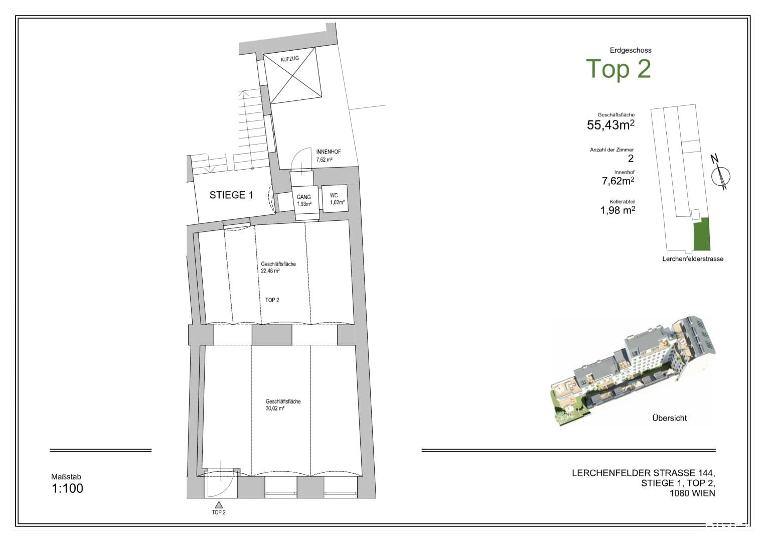 Raumaufteilung // Geschäftslokal ca. 52 m2 // WC // Terrassenfläche (Innenhof)