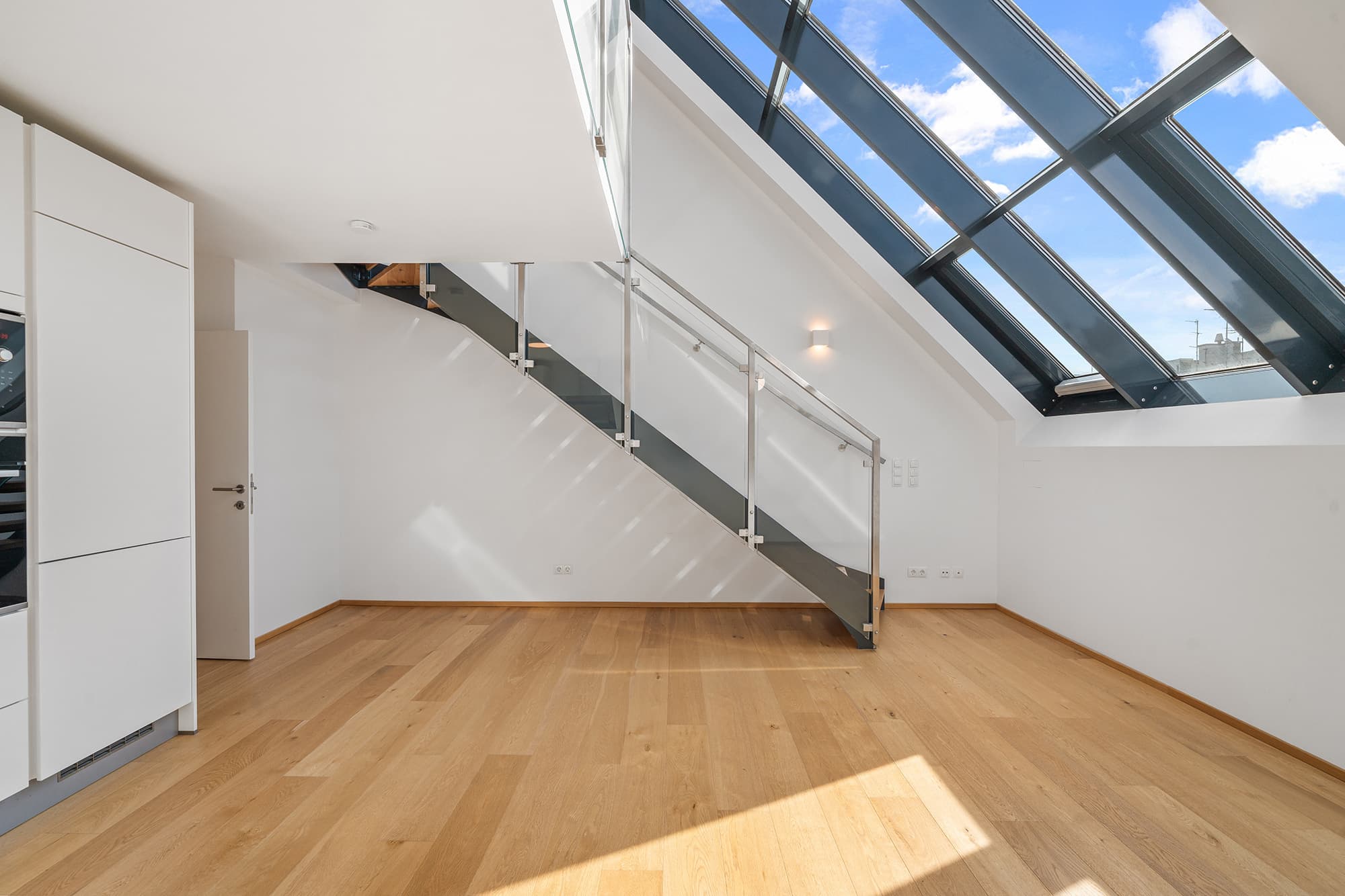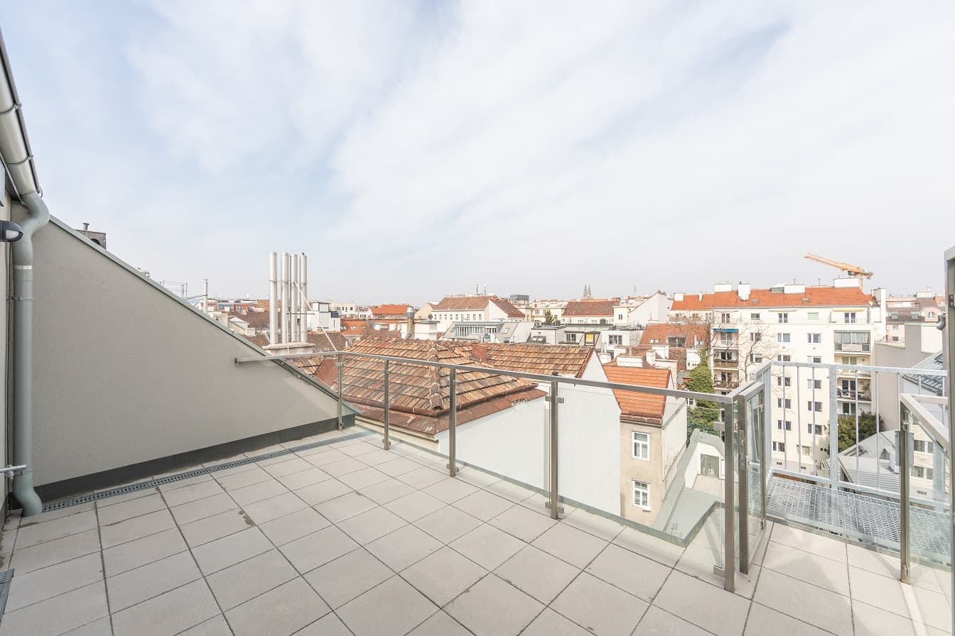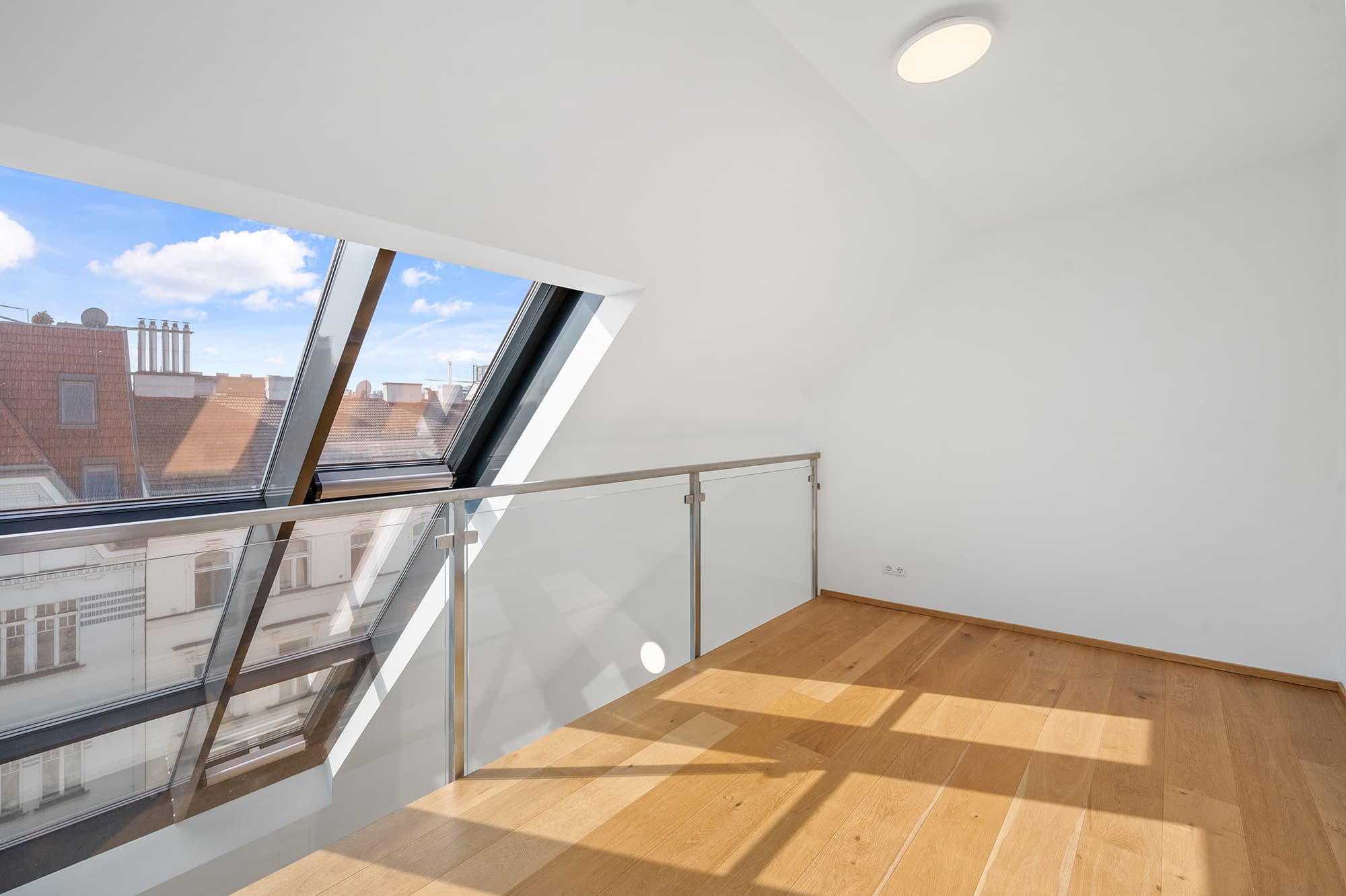 Das 2. Dachgeschoss bietet eine offen gestaltete Galerieebene, die sich ideal als gemütlicher Rückzugsbereich oder Home-Office nutzen lässt. Von hier aus gelangt man auf die Terrasse, die mit einem schönen Blick über die Dächer Wiens beeindruckt und zusätzlichen Freiraum im Freien bietet.