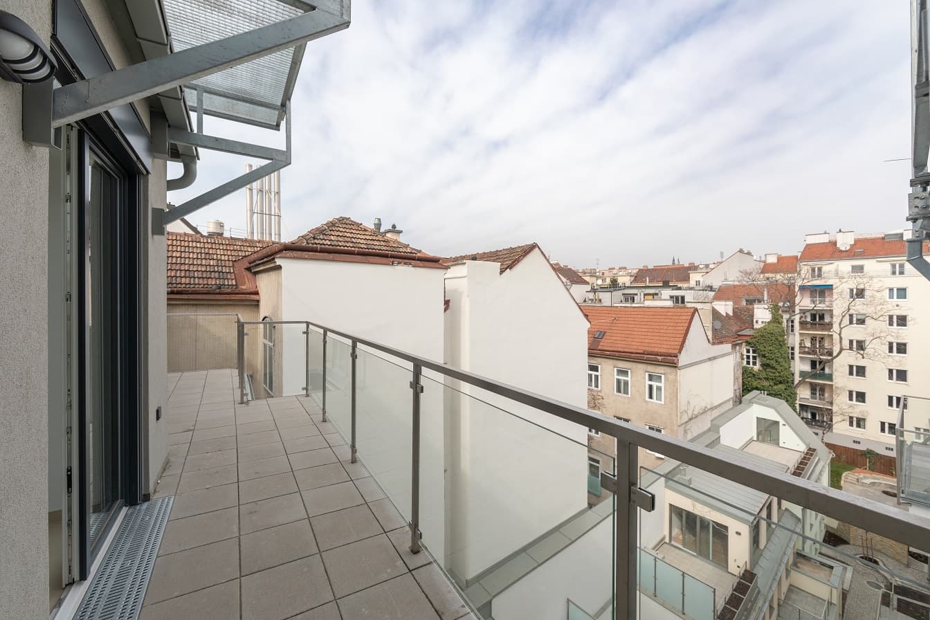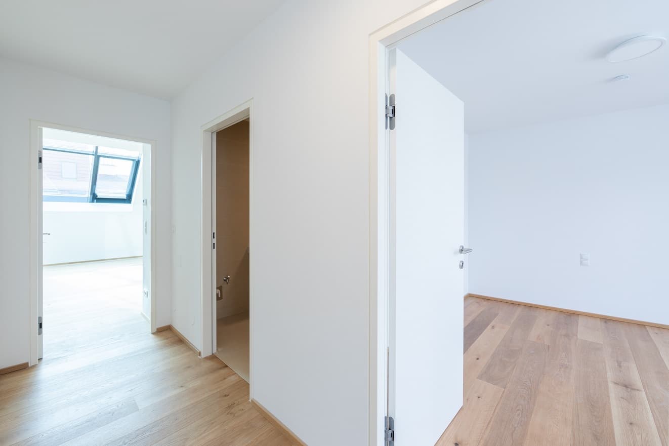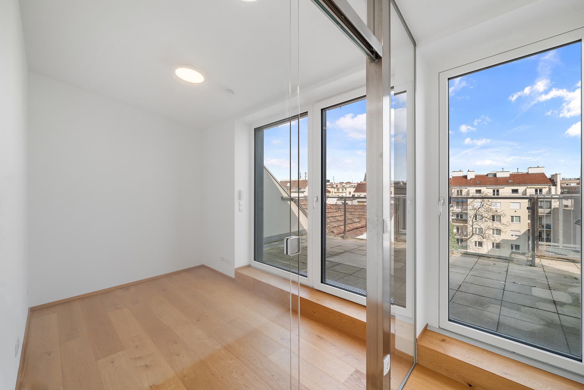 Das 2. Dachgeschoss bietet eine offen gestaltete Galerieebene, die sich ideal als gemütlicher Rückzugsbereich oder Home-Office nutzen lässt. Von hier aus gelangt man auf die Terrasse, die mit einem schönen Blick über die Dächer Wiens beeindruckt und zusätzlichen Freiraum im Freien bietet.