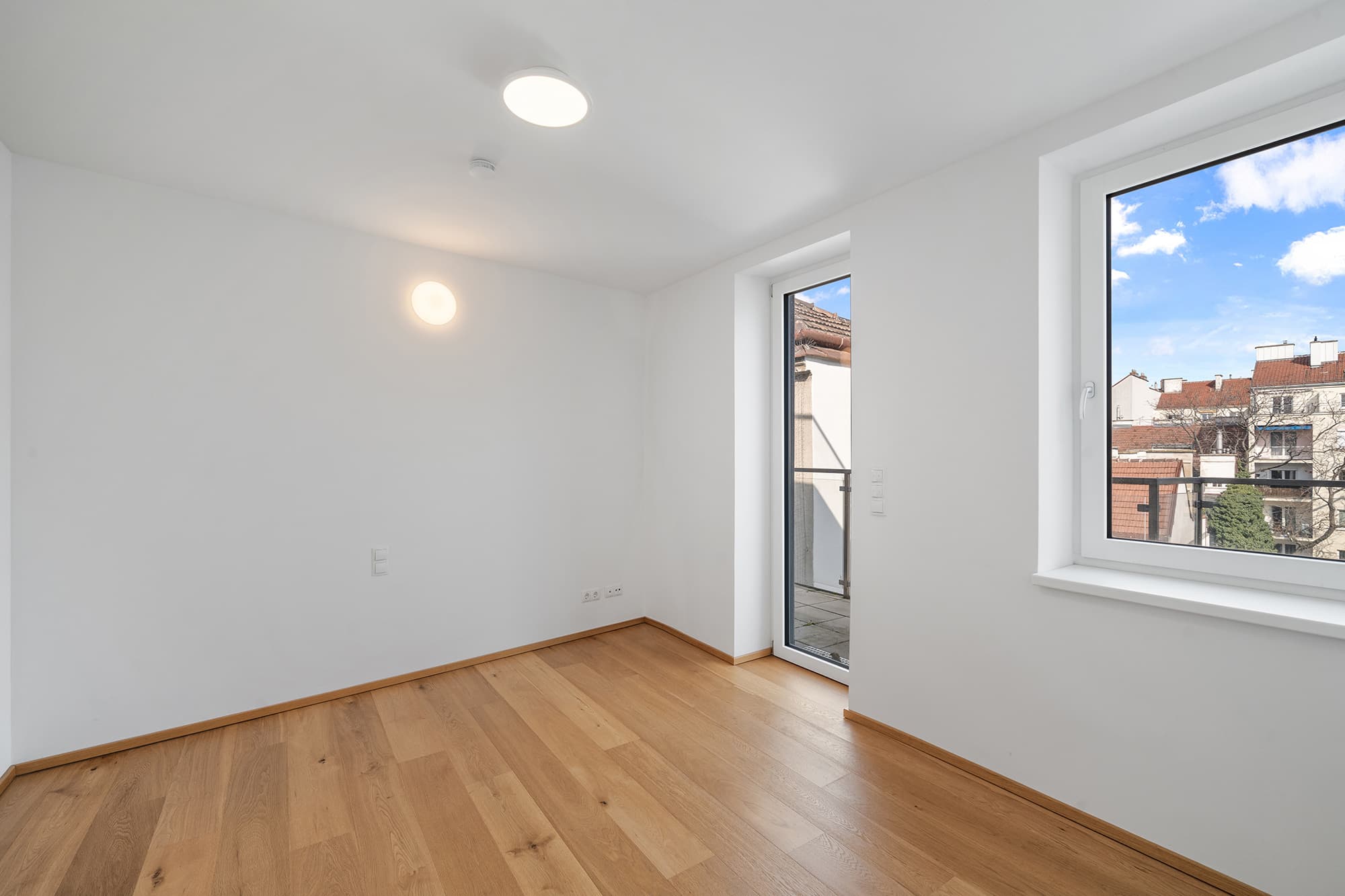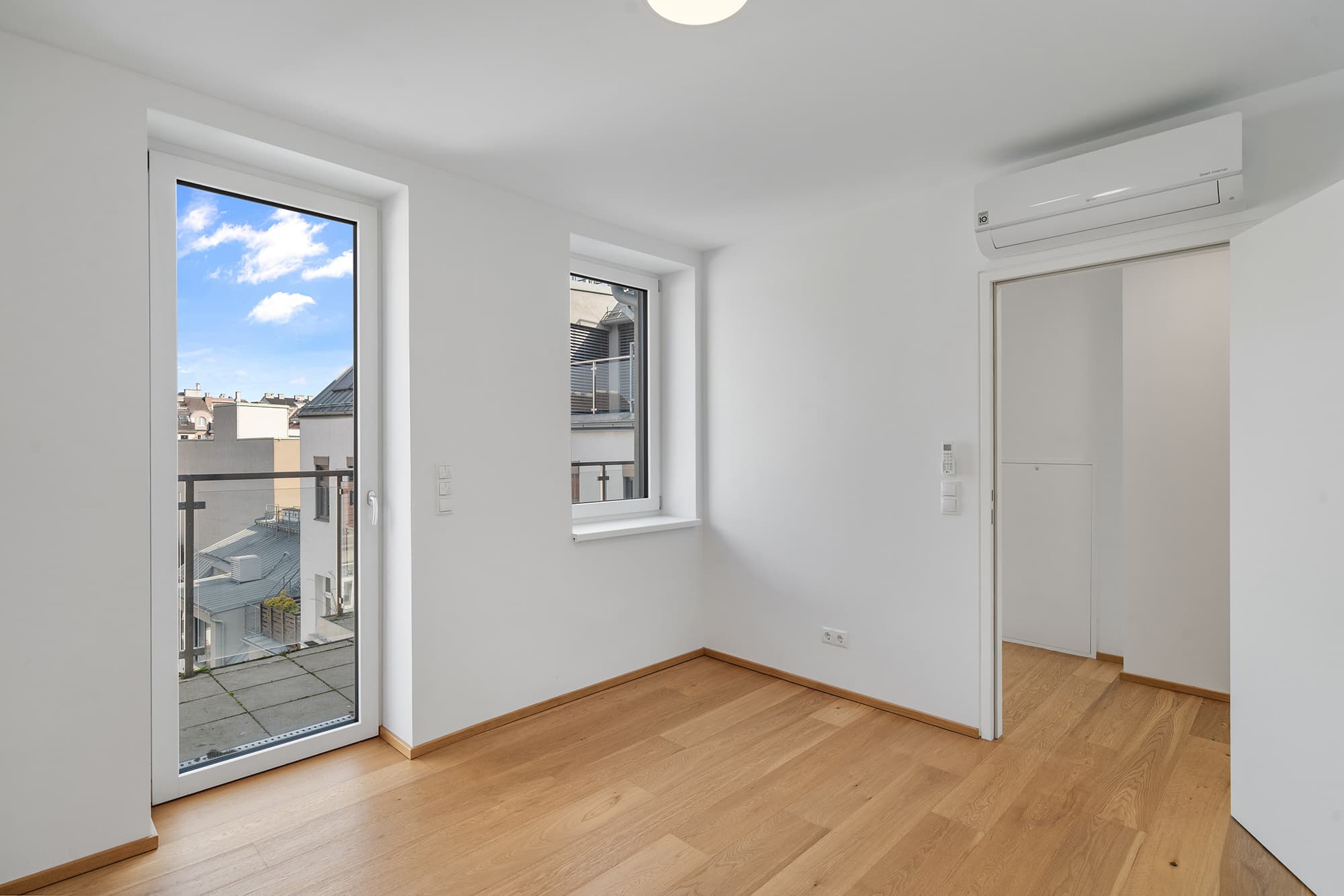 Vom Vorraum sowie vom Schlafzimmer aus gelangt man auf den ruhig zum Innenhof ausgerichteten Balkon, der einen geschützten Rückzugsort mitten in der Stadt bietet.