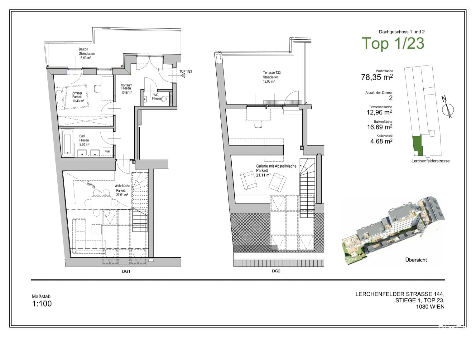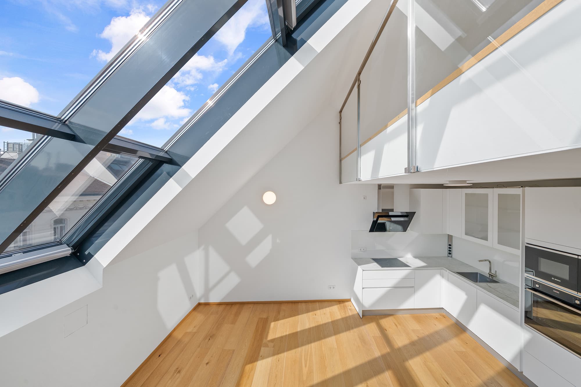 Die Wohnung erstreckt sich über zwei Ebenen. Im 1. Dachgeschoss befindet sich der Wohn- und Essbereich, der dank der großflächigen Verglasungen lichtdurchflutet ist und eine angenehme Wohnatmosphäre schafft. Die moderne Einbauküche ist harmonisch in den Wohnbereich integriert. Weiters stehen ein Schlafzimmer, ein Badezimmer sowie ein separates WC zur Verfügung.