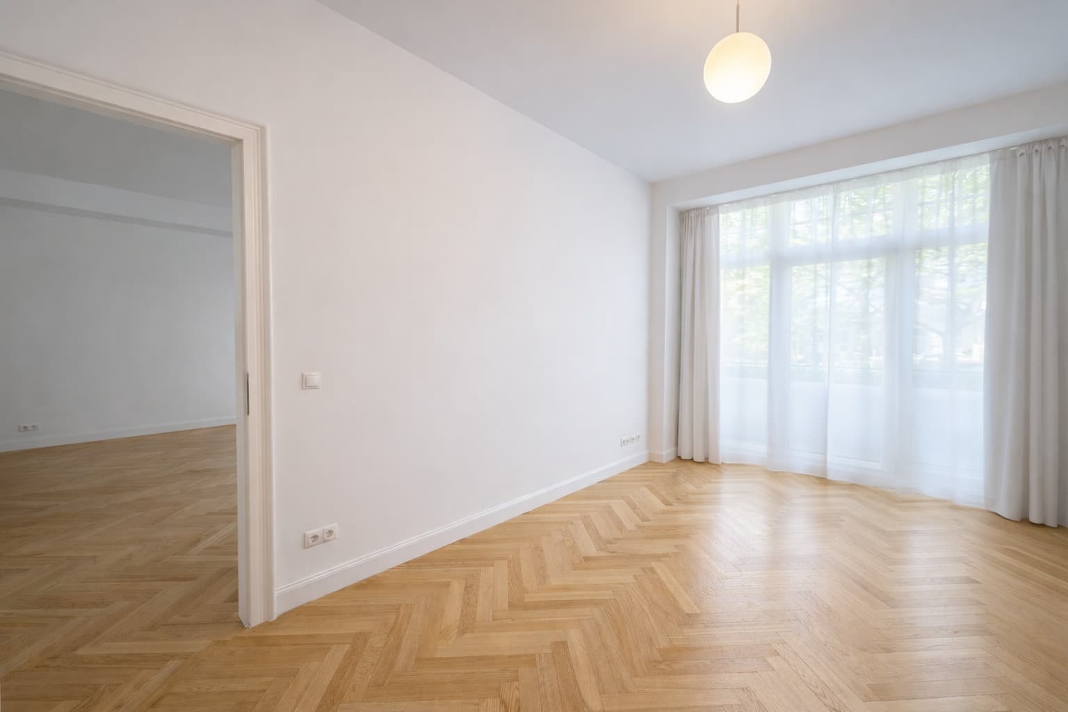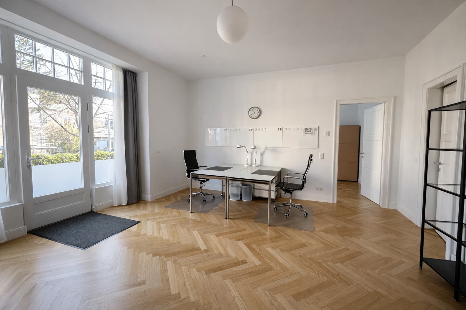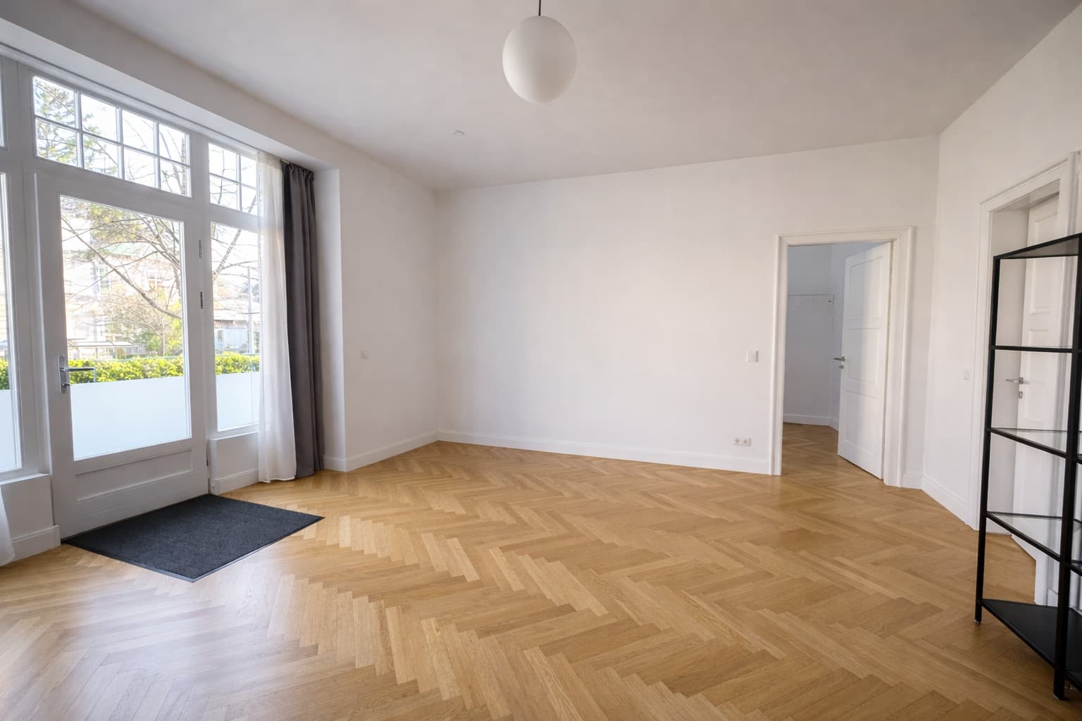 Die Wohnung selbst wurde vor etwa acht Jahren saniert und befindet sich in sehr gutem Zustand. Fischgrätparkett, Fußbodenheizung und große Fenster mit Blick auf Terrasse und Eigengarten schaffen eine helle, hochwertige Wohnatmosphäre. Aktuell ist eine kleine Teeküche vorhanden, da die Wohnung zuvor als Büro genutzt wurde. Die Anschlüsse für eine vollwertige Küche befinden sich bereits im Wohnbereich.