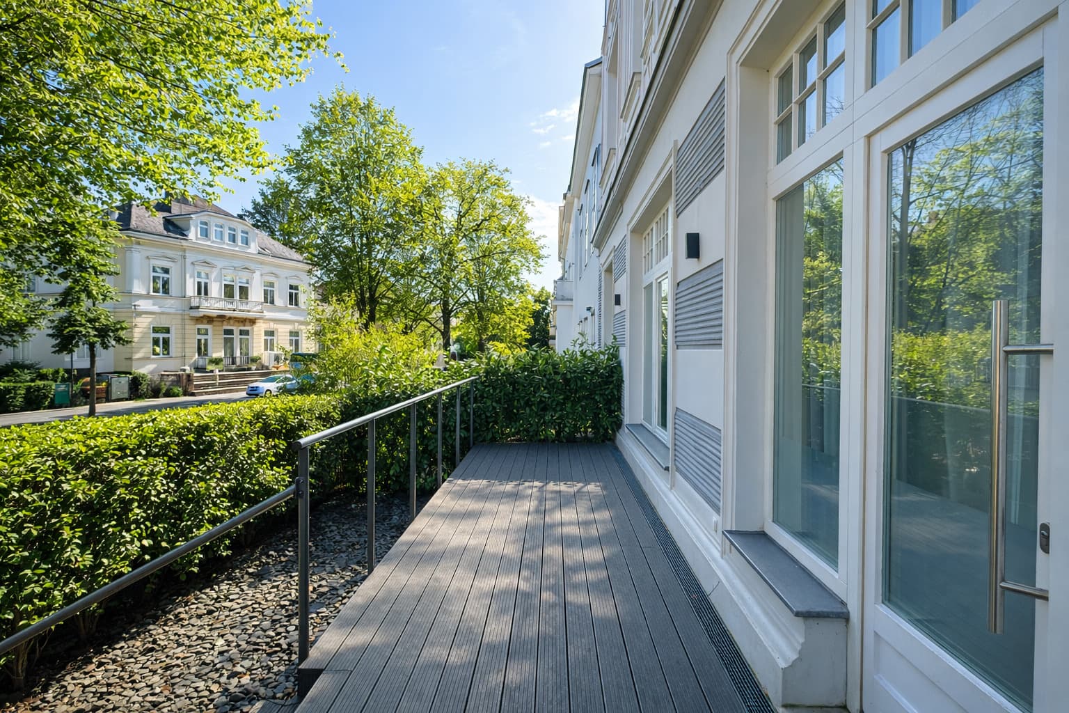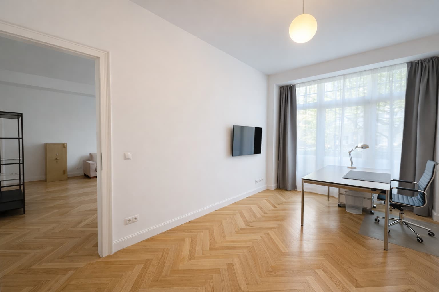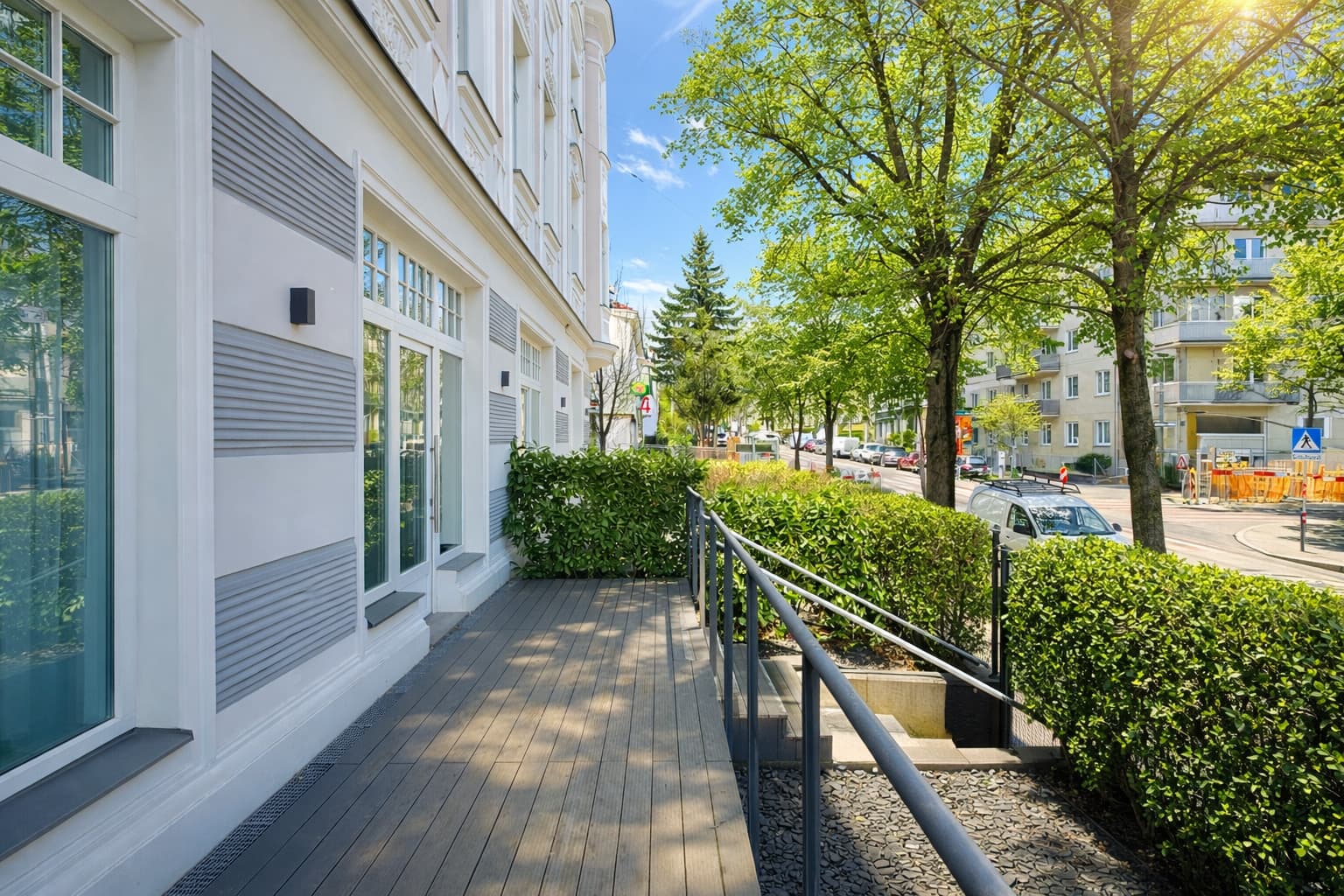 Die Wohnung selbst wurde vor etwa acht Jahren saniert und befindet sich in sehr gutem Zustand. Fischgrätparkett, Fußbodenheizung und große Fenster mit Blick auf Terrasse und Eigengarten schaffen eine helle, hochwertige Wohnatmosphäre. Aktuell ist eine kleine Teeküche vorhanden, da die Wohnung zuvor als Büro genutzt wurde. Die Anschlüsse für eine vollwertige Küche befinden sich bereits im Wohnbereich.