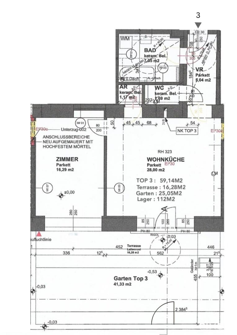 // Vorraum // Wohnküche mit Ausgang auf die Terrasse und Garten // Schlafzimmer // Badezimmer mit Wanne, Dusche und Waschtisch // Abstellraum mit kleiner Teeküche // Lager mit 112m2 im Keller (leer, ohne Regale und Inventar)